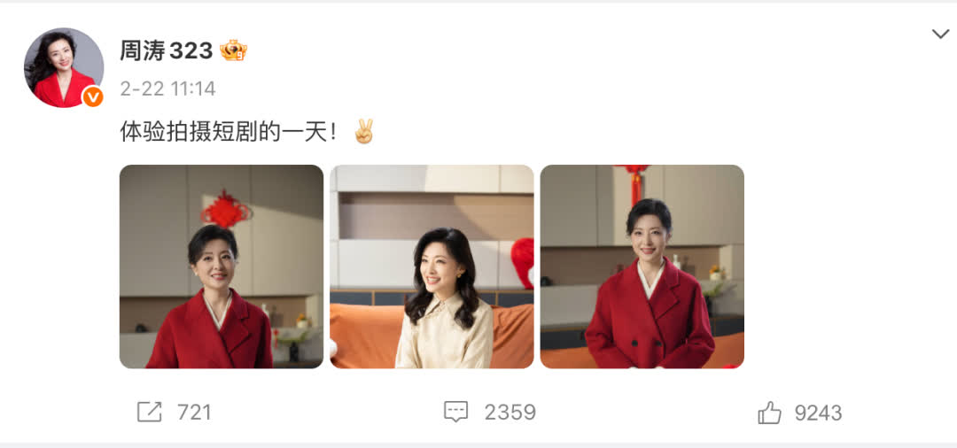 近日,前央視主持人周濤更新社交媒體稱:「體驗拍攝短劇的一天!」她在視頻中表示,第一次拍短劇很好玩,創作過程中自己的狀態很輕鬆。