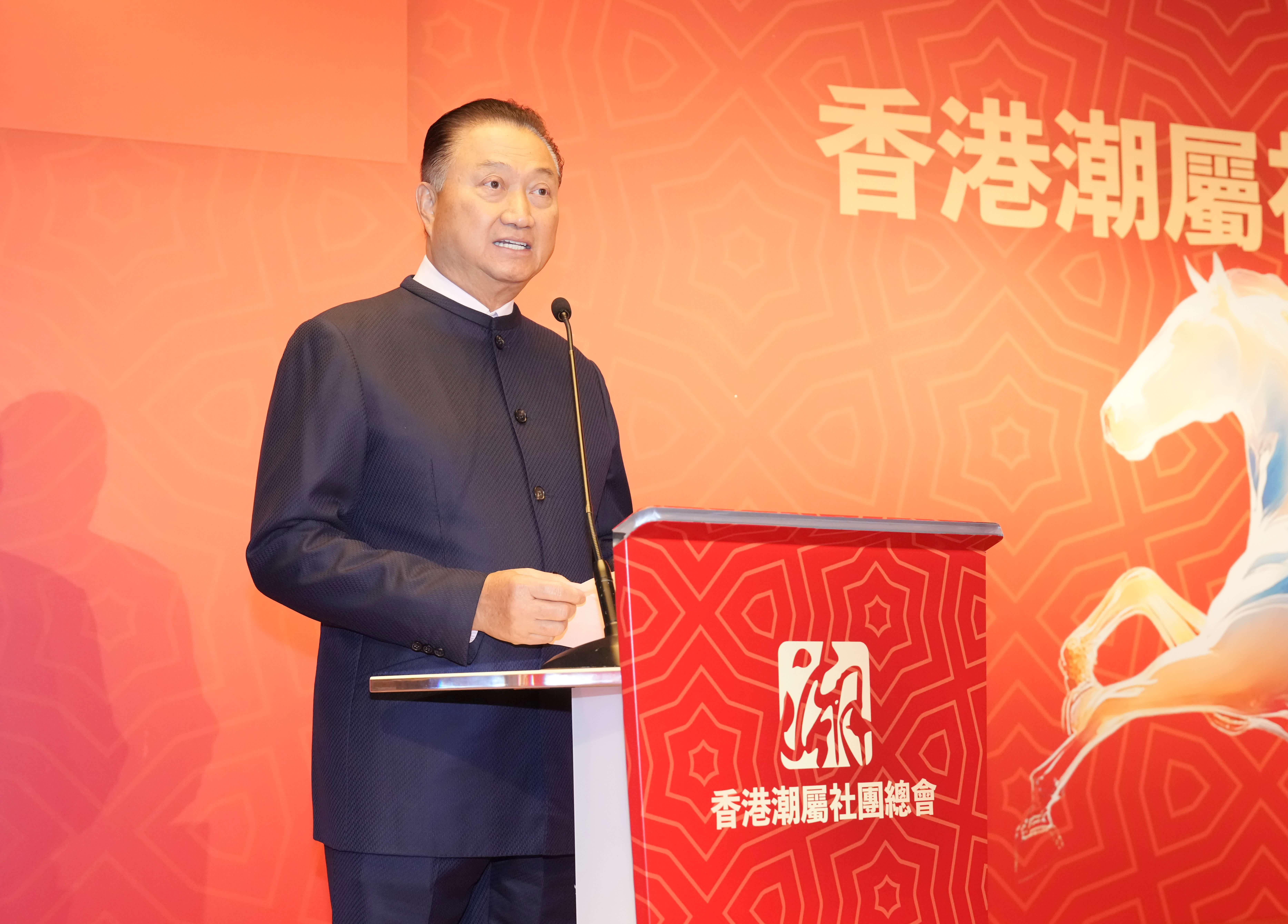 香港潮屬社團總會主席胡定旭致辭時表示,「老馬識途」是閱歷與沉澱,「龍馬精神」是奮鬥與擔當,潮總自陳偉南先生創會以來薪火相傳,各項工作離不開各方支持。潮總秉持「團結潮人、扎根香港、凝聚力量、攜手並進」的宗旨,推動潮州文化傳承,開展基層關愛、獎助學金等公益,鼓勵鄉賢參政議政,展現潮人家國情懷。2026年是國家「十五五」規劃開局之年,潮總將堅定擁護「一國兩制」,支持特區政府依法施政,發揮「內聯外通」優勢,擔當「超級聯繫人」「超級增值人」,講好中國故事、香港故事和潮人故事,助力香港融入國家發展大局,並推動青年傳承創新,續寫潮人事業新篇章。