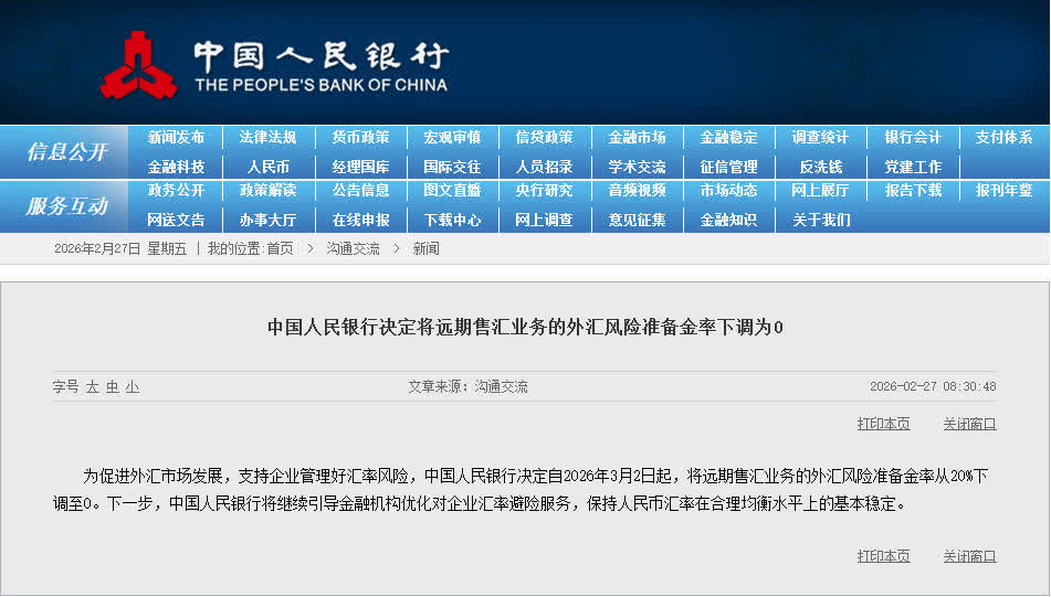 中國人民銀行27日發布消息稱,為促進外匯市場發展,支持企業管理好匯率風險,決定自2026年3月2日起,將遠期售匯業務的外匯風險準備金率從20%下調至0。