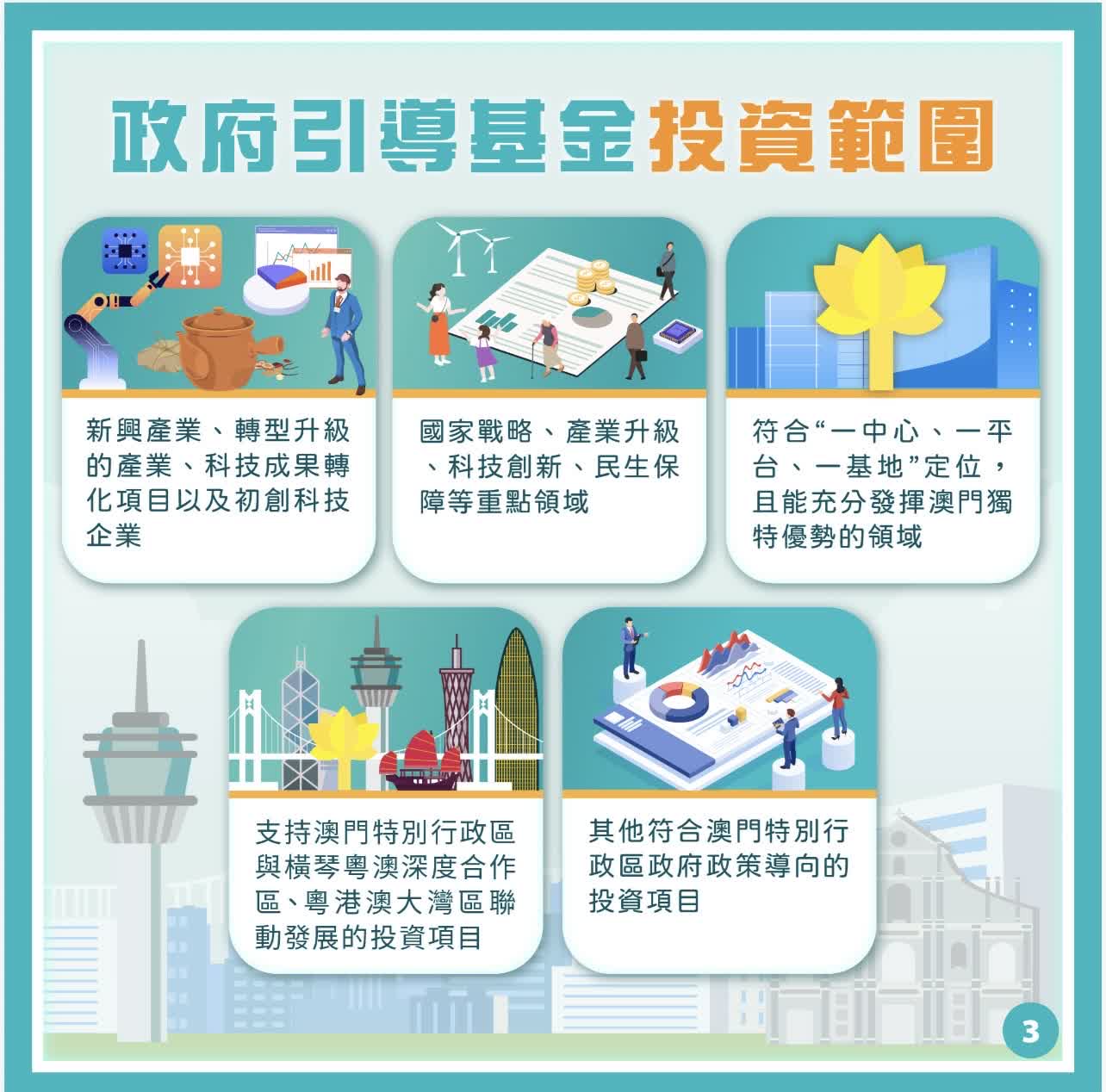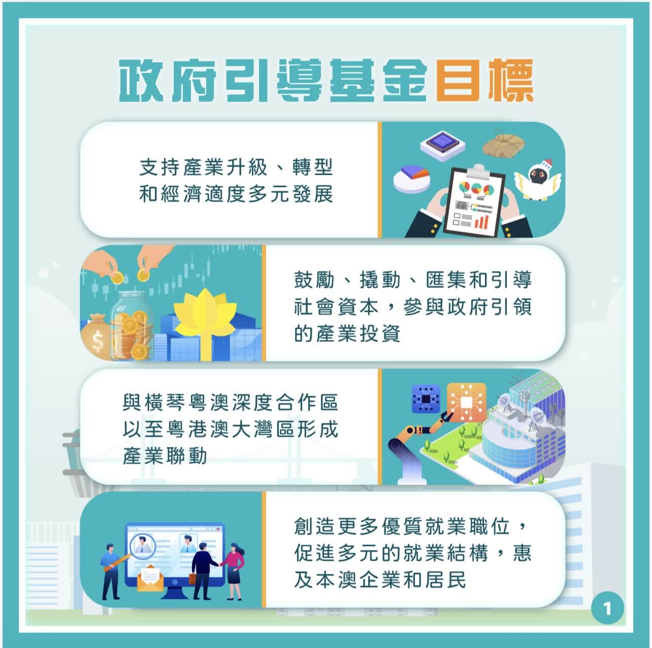透過基金發揮引領作用,引導不同類型的社會資本共同投向重點企業及產業領域,包括:新興產業、轉型升級產業、科技成果轉化項目及初創科技企業;聚焦國家戰略、產業升級、科技創新、民生保障等重點領域;符合「一中心、一平台、一基地」的發展定位,並充分發揮澳門獨特優勢的領域;支持澳門特區與合作區、大灣區聯動發展的投資項目,以及其他符合政府政策導向的投資項目等。基金將堅持「長期主義」及「耐心資本」的理念,着重培育對本澳經濟有實際推動作用的新興產業和未來產業。