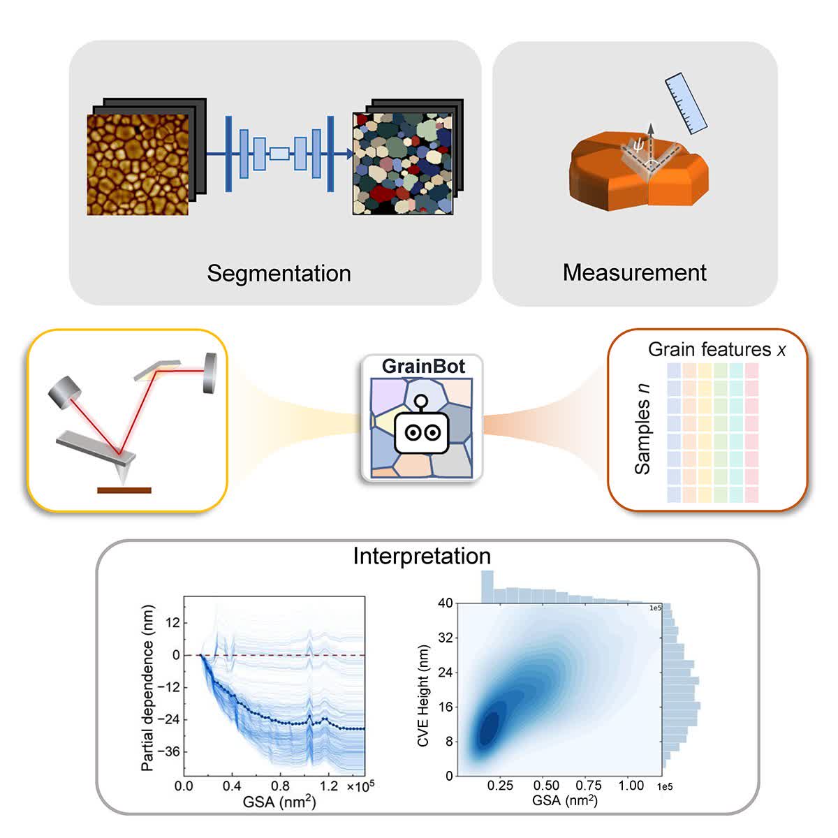 團隊並以高效太陽能電池關鍵材料——金屬鹵化物鈣鈦礦薄膜驗證工具效能。透過分析不同底部表面形貌樣本的原子力顯微鏡圖像,GrainBot成功建構涵蓋數千顆獨立晶粒的數據庫,並為每顆晶粒標註多項微結構參數;配合統計分析,可找出晶粒分佈規律及不同特徵之間以往難以量化的關係,例如晶粒尺寸、溝槽幾何形狀與表面粗糙度的隱藏關聯。