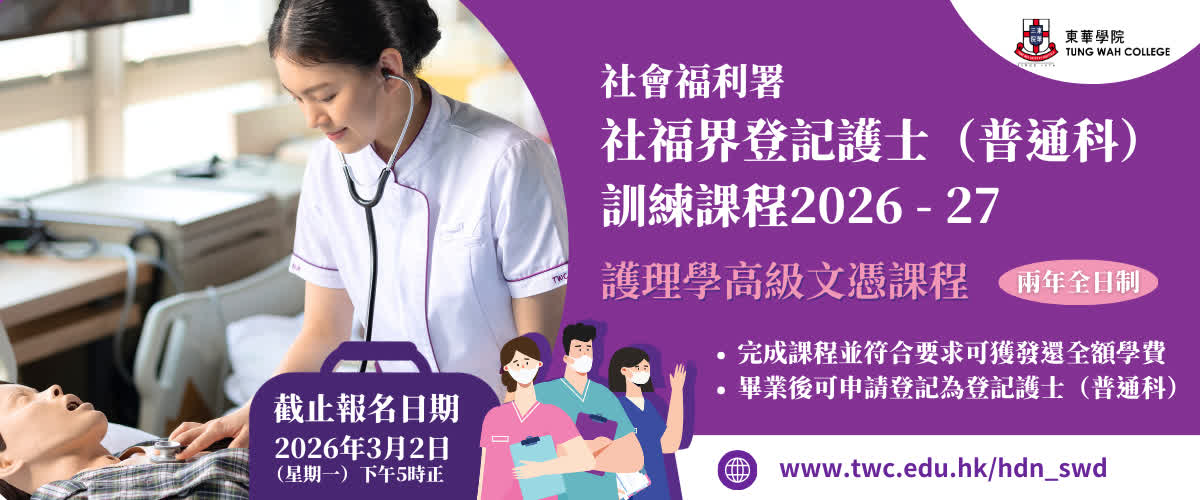 香港文匯報訊 東華學院今年繼續獲社會福利署委託,推出「社福界登記護士(普通科)訓練課程2026-27」,課程為兩年全日制護理學高級文憑,由社會福利署主辦及資助,旨在培育有志成為登記護士(普通科)並投身社會福利界的人才,以紓緩業界護士人手短缺。完成課程並符合要求的學員,可獲發還全額學費,報名將於3月2日 (星期一)下午5時截止。