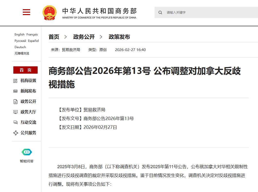 商務部27日發布公告,公布調整對加拿大反歧視措施,決定自2026年3月1日至2026年12月31日期間,對原產於加拿大的部分進口商品不加徵反歧視措施相關關稅。