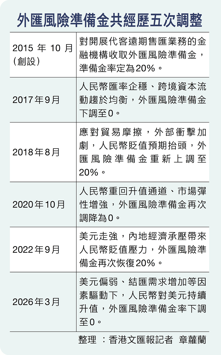 香港文匯報訊(記者 章蘿蘭 上海報道)中國人民銀行昨日(27日)發布消息稱,為促進外匯市場發展,支持企業管理好匯率風險,決定自2026年3月2日起,將遠期售匯業務的外匯風險準備金率從20%下調至0。市場分析指,時隔近三年半,央行再次啟動此項工具,意在合理退出前期措施,從早前「抑制貶值」 的應急干預,轉向常態化管理,令到市場機制更充分發揮作用,減少匯市順周期「羊群效應」,維持人民幣匯率在合理均衡水平上的基本穩定。