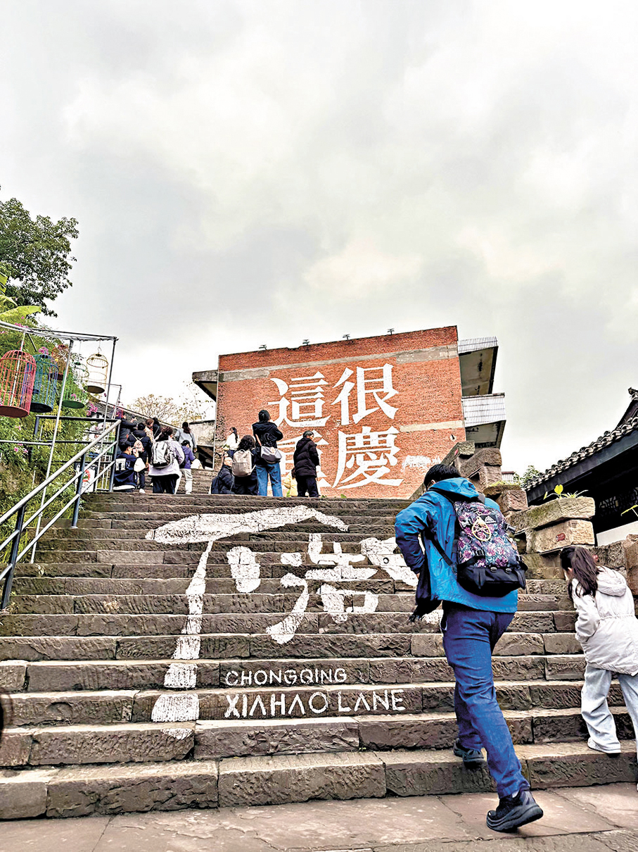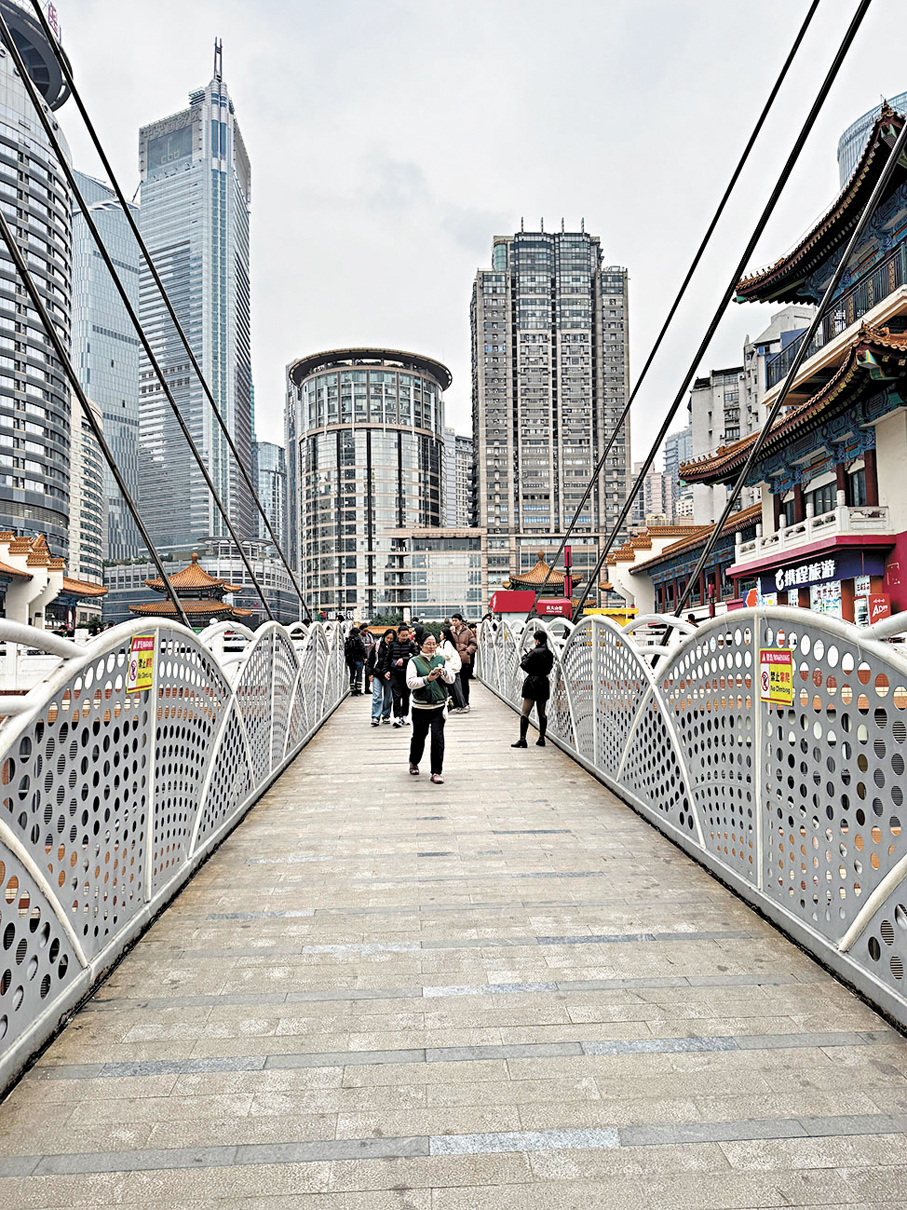 洪崖洞「金碧輝煌」的外表下,人流如織,不過無論車流還是人流,大家都十分禮讓。不斷走走停停打卡的旅客們、叫嚷着拍攝生意的街頭攝影檔、維持着秩序的公安,以及賣着各種小吃飲料的小販等等,在繁華的燈光下充斥着人間的煙火氣。在江上更有大量觀光船不停來回行駛,讓乘客欣賞美景,看着如此景象,有時候會讓人完全忘了時間的流逝,夜間恍如白晝,直至洪崖洞晚上11時準點關燈,人潮方才開始散去。相對香港來說,重慶好像更符合「夜繽紛」的描述,而夜生活亦是重慶的一大亮點,很多公路直至凌晨仍在堵車,即使非假日亦是如此,令人聯想起從前香港的油尖旺,愈夜愈精彩。而最近紅爆網絡的「重慶機車」,無數輛機車載着年輕人在橋上飛馳而過,打卡江邊重慶的晚間繁華景色,洋溢着青年人不羈的浪漫。