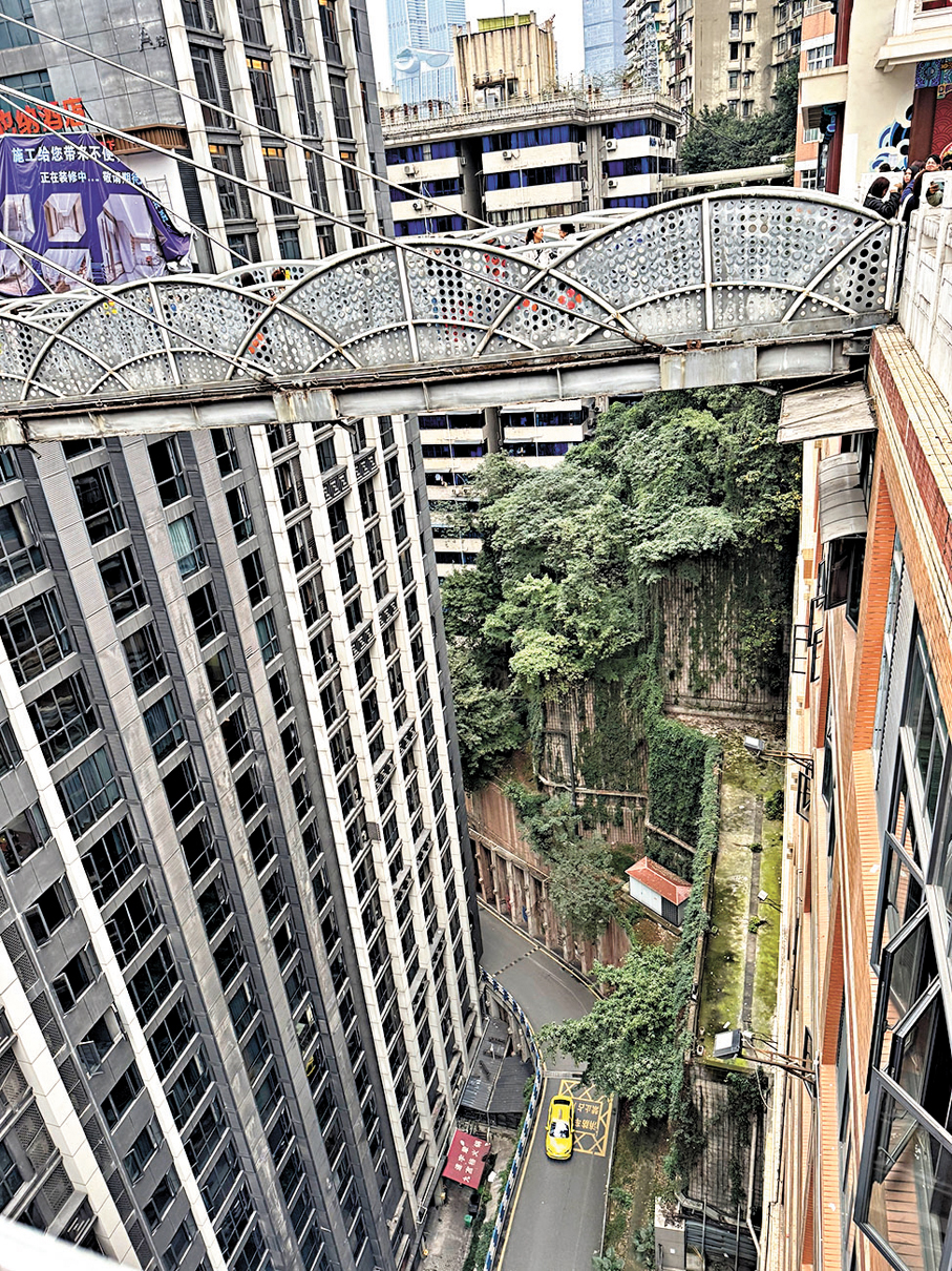 電影《少年的你》中,小北獨自走過臨江門的魁星樓的一刻,成為觀眾久久難忘的回憶。網上衝浪的時候,有時候也會看到一些「為什麼不能在重慶跑酷,因為你不會知道你到底在哪一層」。作為8D城市的重慶,最強烈的印象,想必就是你以為你身在平地,但其實你在半空,非常立體,也是重慶相比其他城市,無法模仿的地方,兩道懸空天橋和旁邊高樓連為一體,是新晉的「網紅」景點。不過先旨聲明,恐高人士還是要留神,不然就腿軟了。