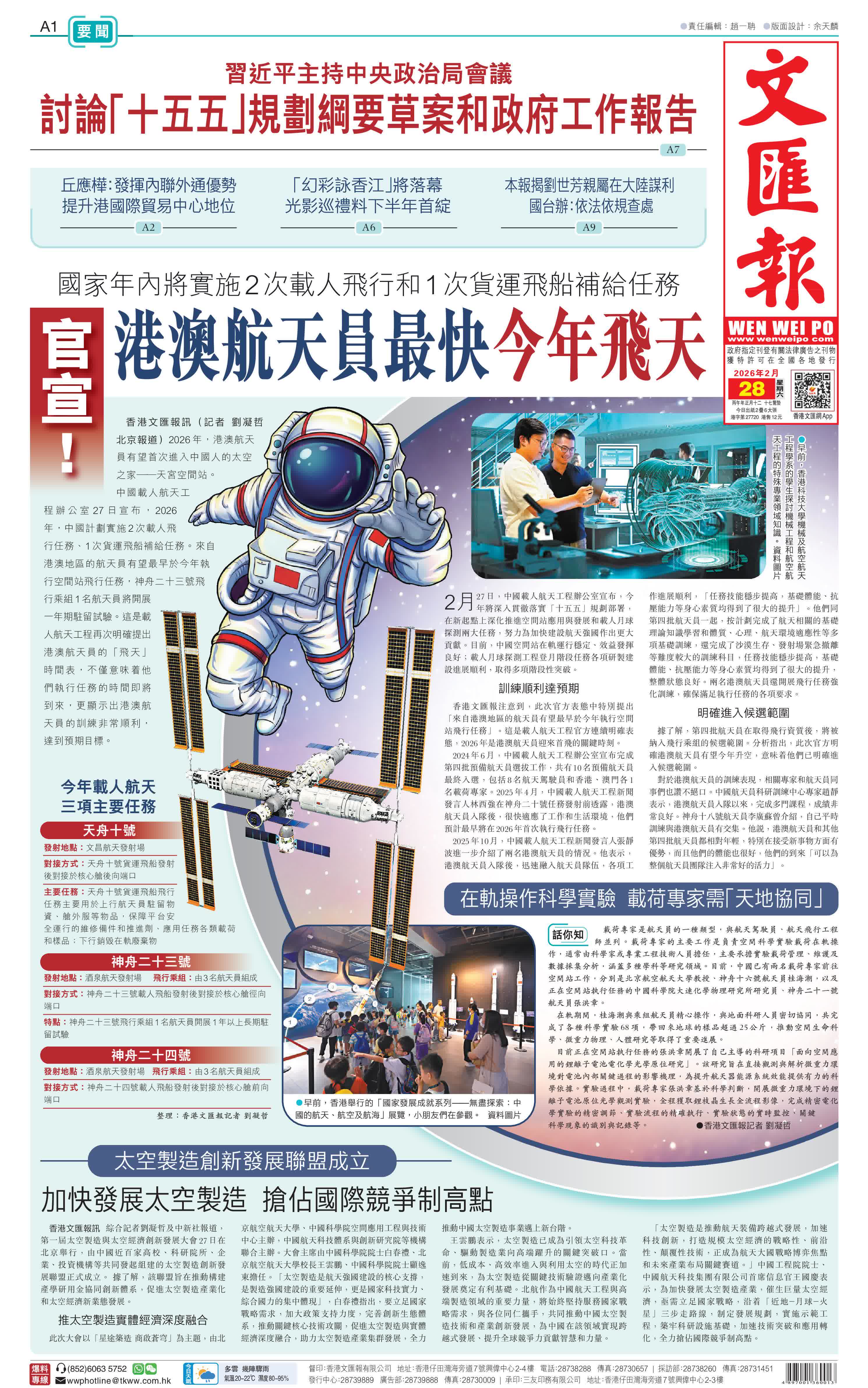 香港文匯報訊(記者 劉凝哲 北京報道)2026年,港澳航天員有望首次進入中國人的太空之家——天宮空間站。中國載人航天工程辦公室27日宣布,2026年,中國計劃實施2次載人飛行任務、1次貨運飛船補給任務。來自港澳地區的航天員有望最早於今年執行空間站飛行任務,神舟二十三號飛行乘組1名航天員將開展一年期駐留試驗。這是載人航天工程再次明確提出港澳航天員的「飛天」時間表,不僅意味着他們執行任務的時間即將到來,更顯示出港澳航天員的訓練非常順利,達到預期目標。