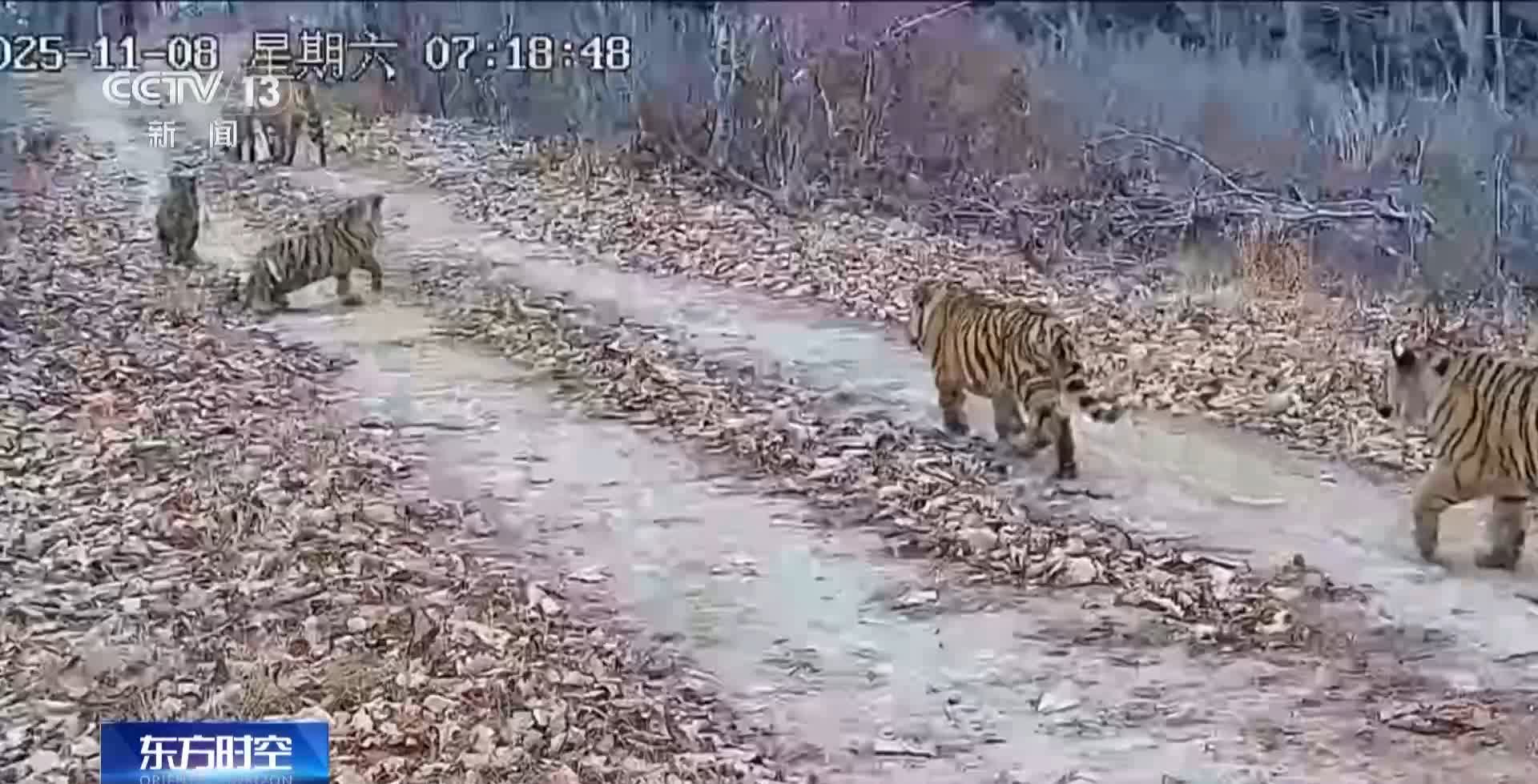 2025年11月初,同樣是在琿春,野外觸發式紅外相機在三天內兩次記錄到了「一虎帶五崽」的畫面。一隻體形修長、花紋斑斕的母虎,正帶着它的幾隻幼崽在鏡頭前嬉戲。經反覆對比確認,母虎一共帶着五隻幼崽,一家六口整整齊齊地出現在紅外相機的鏡頭當中。這個被監測人員戲稱為「六福同框」的世界罕見影像,鮮活印證了發生在吉林琿春原野中的真實奇跡。這些珍貴畫面經由總台央視新聞頻道播出,一時成為關注的焦點。