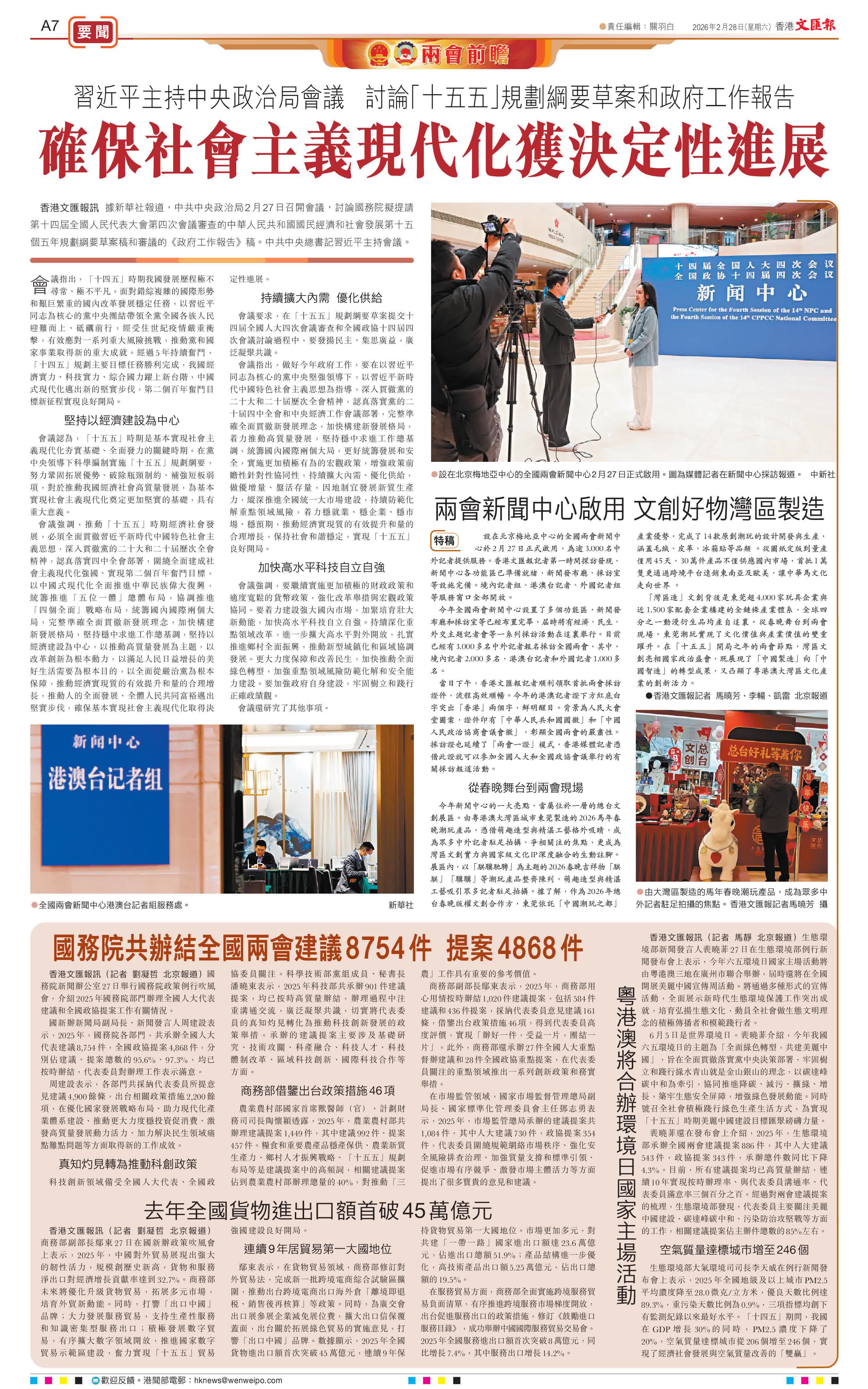 國新辦新聞局副局長、新聞發言人周建設表示,2025年,國務院各部門,共承辦全國人大代表建議8,754件,全國政協提案4,868件,分別佔建議、提案總數的95.6%、97.3%,均已按時辦結,代表委員對辦理工作表示滿意。