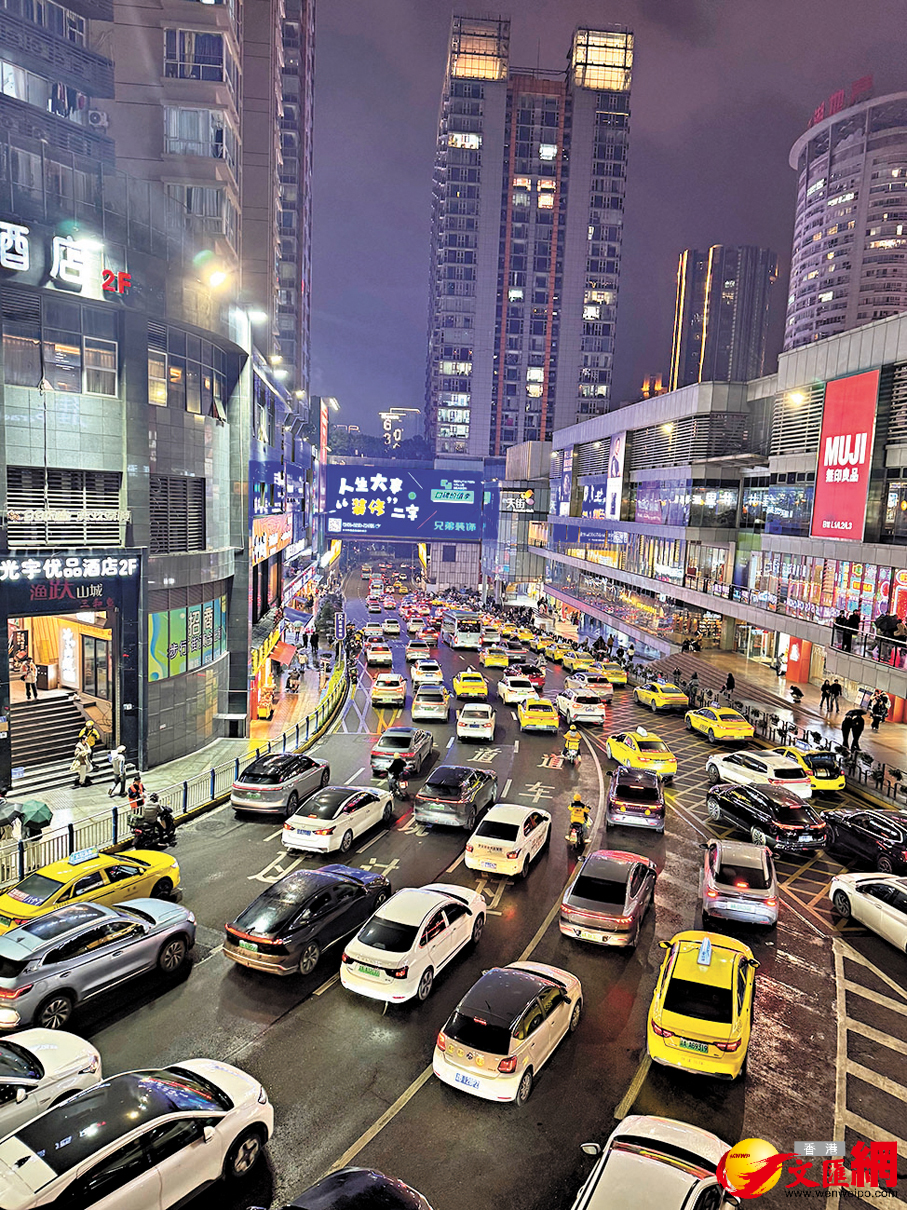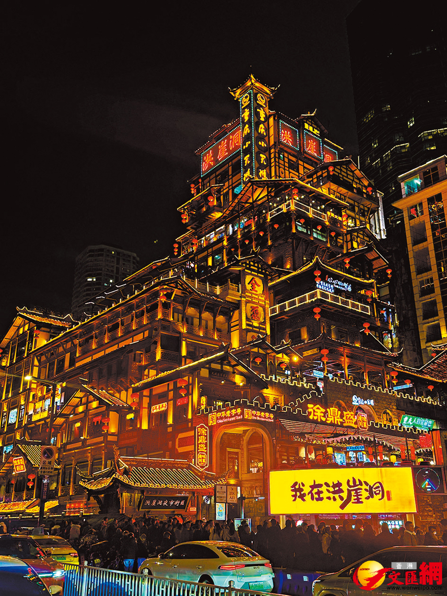洪崖洞「金碧輝煌」的外表下,人流如織,不過無論車流還是人流,大家都十分禮讓。不斷走走停停打卡的旅客們、叫嚷着拍攝生意的街頭攝影檔、維持着秩序的公安,以及賣着各種小吃飲料的小販等等,在繁華的燈光下充斥着人間的煙火氣。在江上更有大量觀光船不停來回行駛,讓乘客欣賞美景,看着如此景象,有時候會讓人完全忘了時間的流逝,夜間恍如白晝,直至洪崖洞晚上11時準點關燈,人潮方才開始散去。相對香港來說,重慶好像更符合「夜繽紛」的描述,而夜生活亦是重慶的一大亮點,很多公路直至凌晨仍在堵車,即使非假日亦是如此,令人聯想起從前香港的油尖旺,愈夜愈精彩。而最近紅爆網絡的「重慶機車」,無數輛機車載着年輕人在橋上飛馳而過,打卡江邊重慶的晚間繁華景色,洋溢着青年人不羈的浪漫。