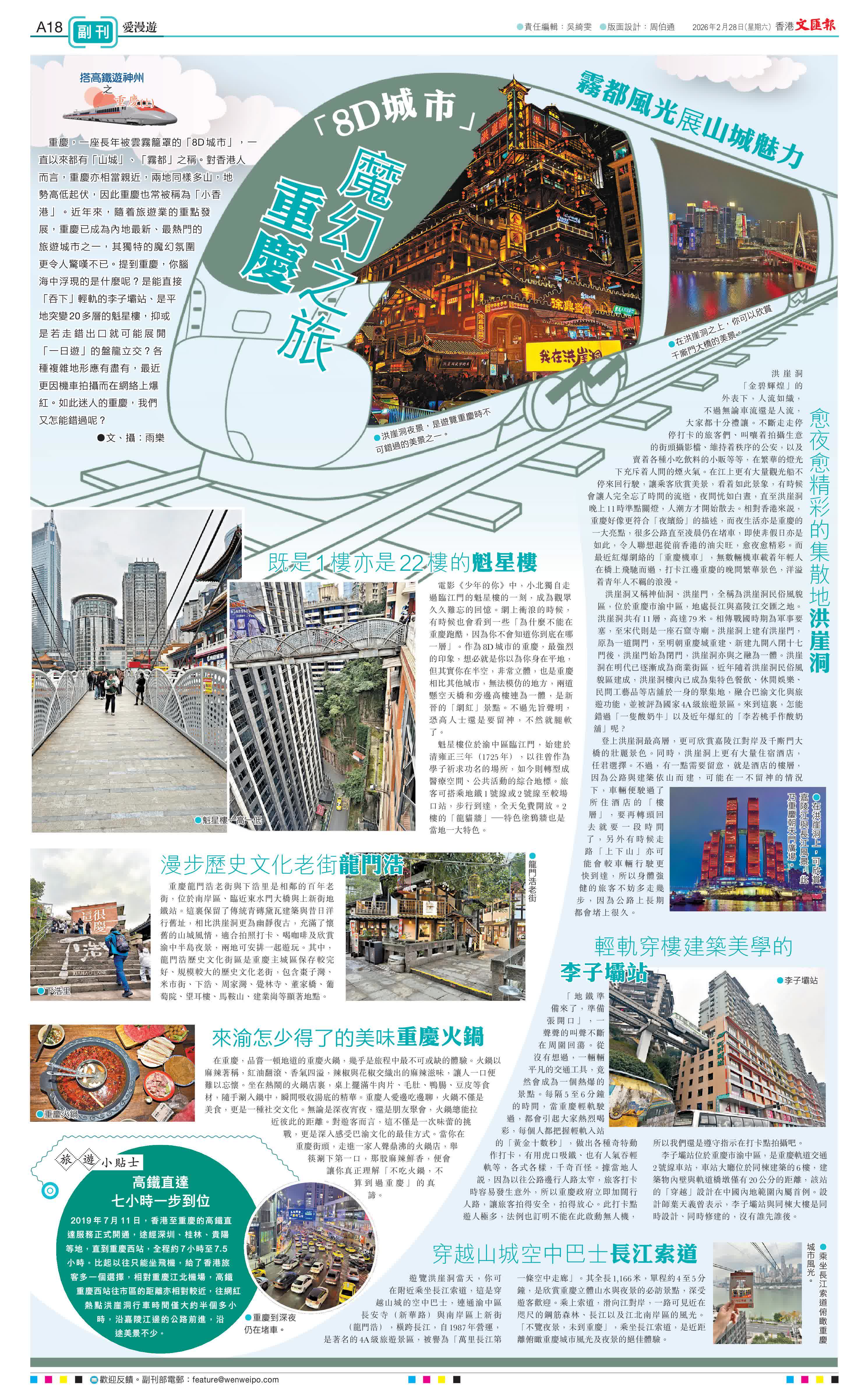 (文:雨樂)重慶,一座長年被雲霧籠罩的「8D城市」,一直以來都有「山城」、「霧都」之稱。對香港人而言,重慶亦相當親近,兩地同樣多山,地勢高低起伏,因此重慶也常被稱為「小香港」。近年來,隨着旅遊業的重點發展,重慶已成為內地最新、最熱門的旅遊城市之一,其獨特的魔幻氛圍更令人驚嘆不已。提到重慶,你腦海中浮現的是什麼呢?是能直接「吞下」輕軌的李子壩站、是平地突變20多層的魁星樓,抑或是若走錯出口就可能展開「一日遊」的盤龍立交?各種複雜地形應有盡有,最近更因機車拍攝而在網絡上爆紅。如此迷人的重慶,我們又怎能錯過呢?