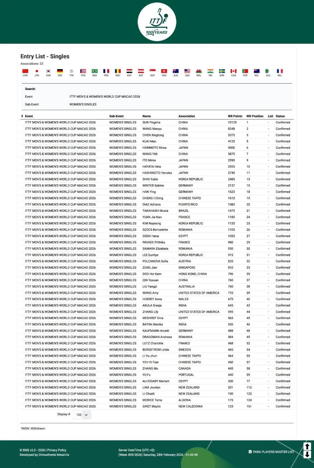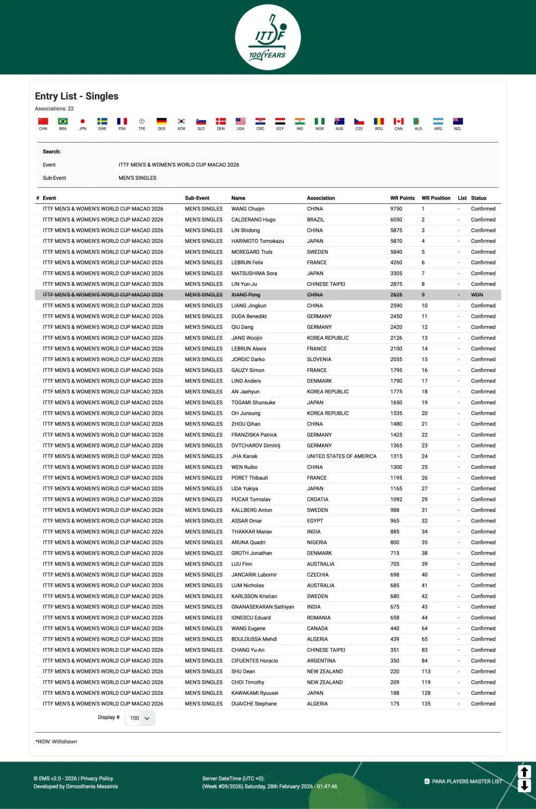 根據國際乒聯在官網顯示的2026年澳門世界盃參賽名單,國乒將會有5名男單選手和6名女單選手參加本屆單打世界盃。