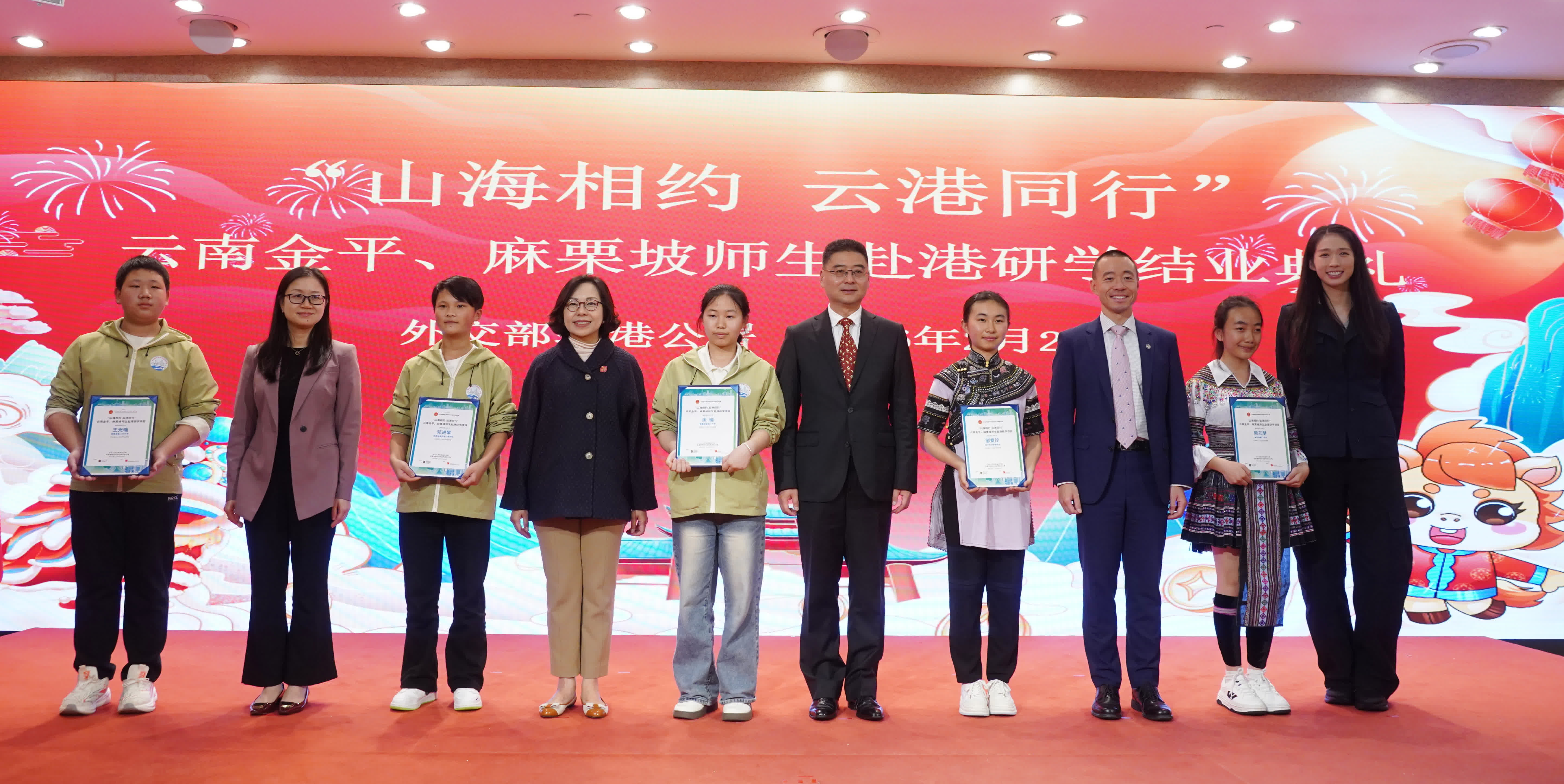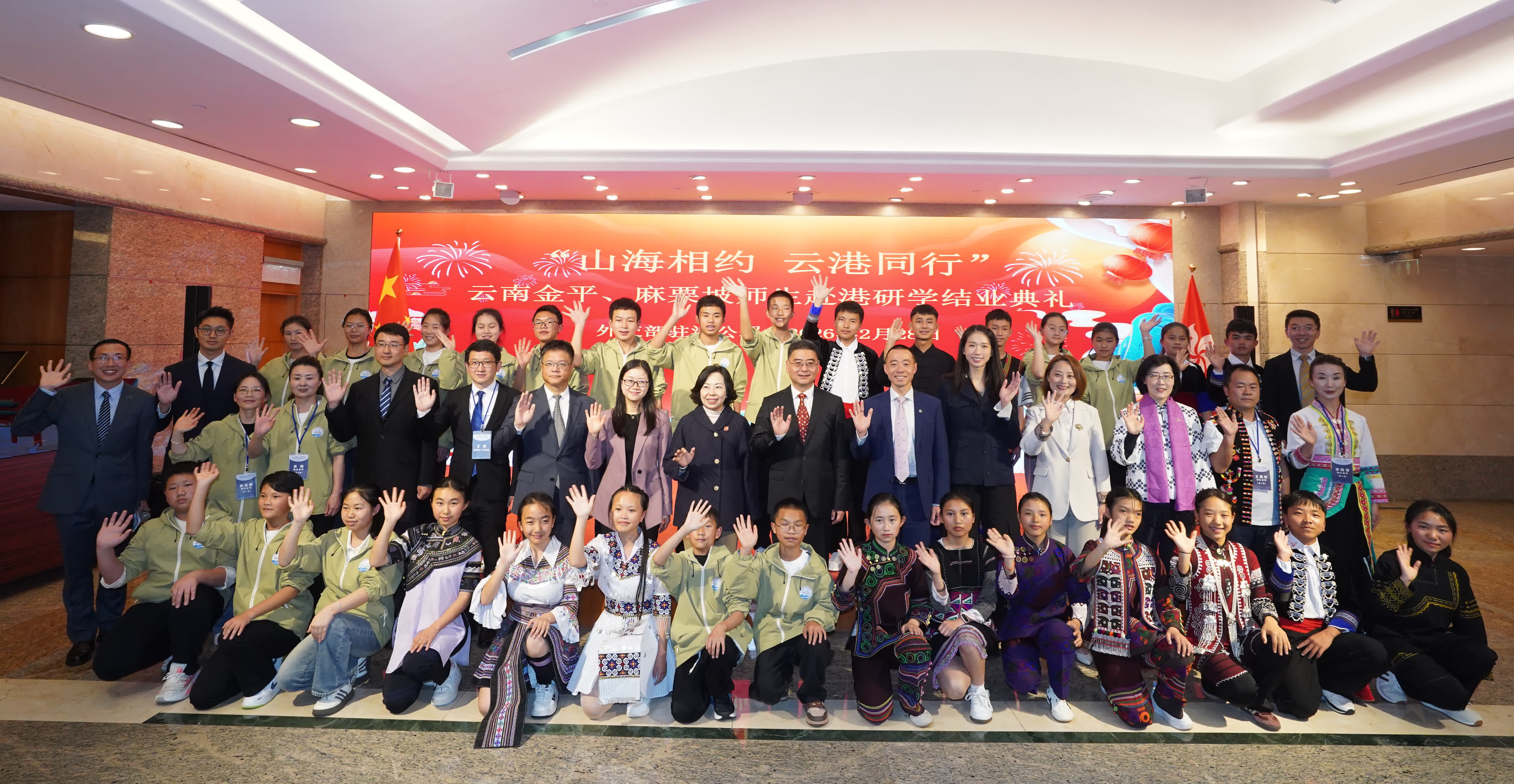 香港文匯報訊(記者 史柳藝)為進一步加深師生對「一國兩制」在香港成功實踐的理解與認同,外交部駐港特派員公署於2月23日至3月1日舉辦「山海相約 雲港同行」雲南金平、麻栗坡師生赴港研學活動。活動於今日(28日)舉辦結業典禮。外交公署副特派員花有、民政及青年事務局局長麥美娟、中央政府駐港聯絡辦青工部副部長萬寧、立法會議員江旻憓等嘉賓出席典禮。