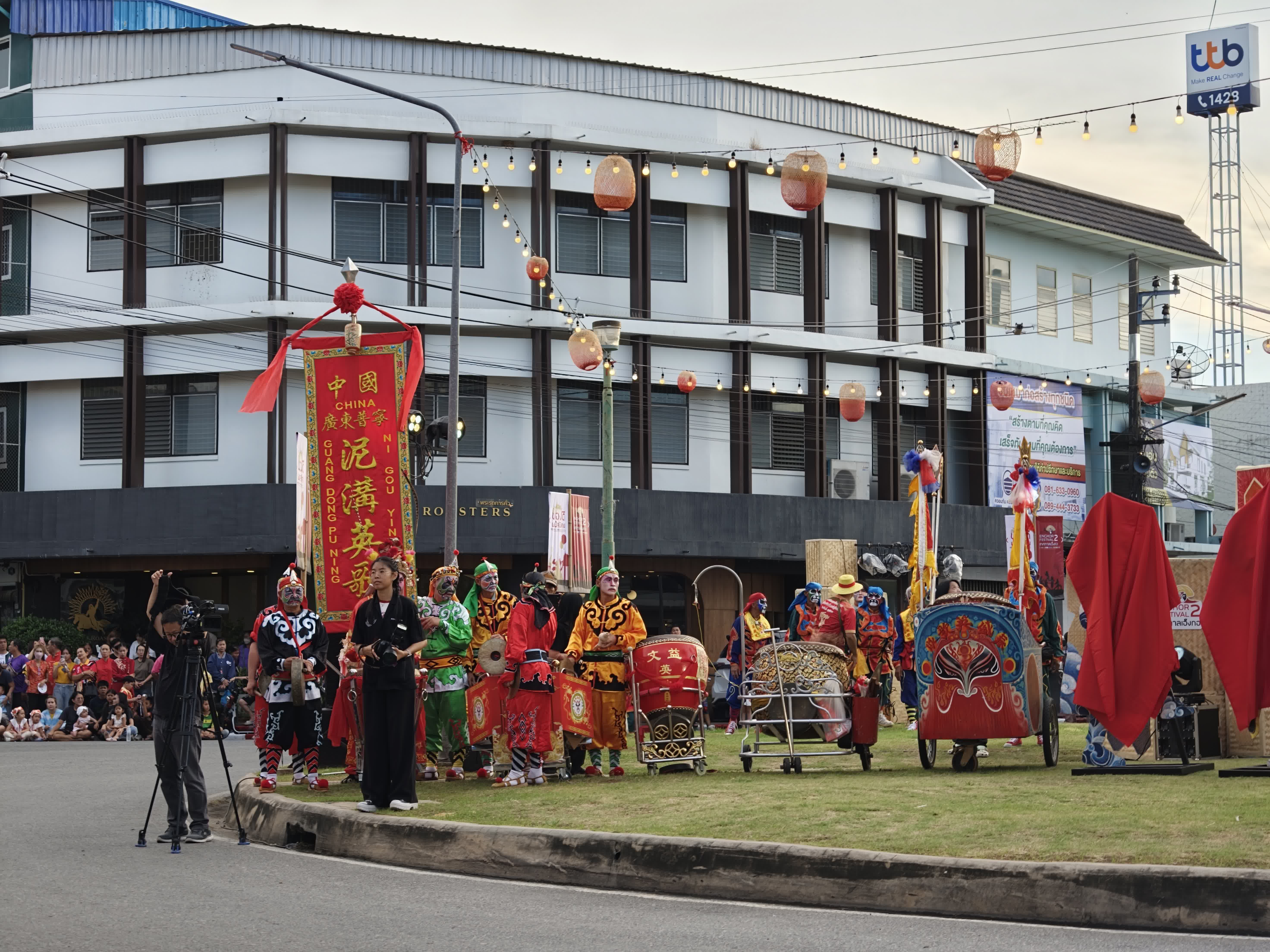 隊伍最前方,一面繡有「中國泥溝英歌」幾個大字的中文旗幟,在異國街頭格外耀眼。隊員們身着鮮艷戲服、面繪傳統臉譜,揮舞雙槌騰躍而出,剛勁的舞步與鏗鏘的鑼鼓聲瞬間點燃整條街道。沿途泰國民眾紛紛駐足喝彩,許多人舉起手機追着隊伍拍攝,驚嘆之聲此起彼伏。
