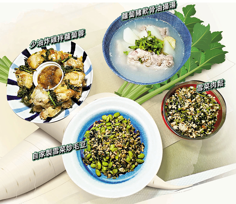 在這個時期,可以多吃蘿蔔。蘿蔔生吃能抗病毒、去風熱,熟吃則有健脾化痰的功效。值得留意的是,蘿蔔頂上的綠色莖葉稱為「蘿蔔纓」,它能提升呼吸系統的抗病毒能力,還能化解腸胃濁氣,調適春節期間豐盛餐食後的積滯。用鹽將蘿蔔纓醃漬,便成為大家熟悉的「雪菜」。蘿蔔外皮帶有微辣的味道,這是因為蘿蔔屬於泥土中的根部,外皮的辣味能抵禦土壤中的昆蟲,因此蘿蔔外皮的有效抗病毒成分甚至比蘿蔔本身更多。由此可見,整根蘿蔔的葉、莖與根,都是十分適合驚蟄節氣的養生食材。