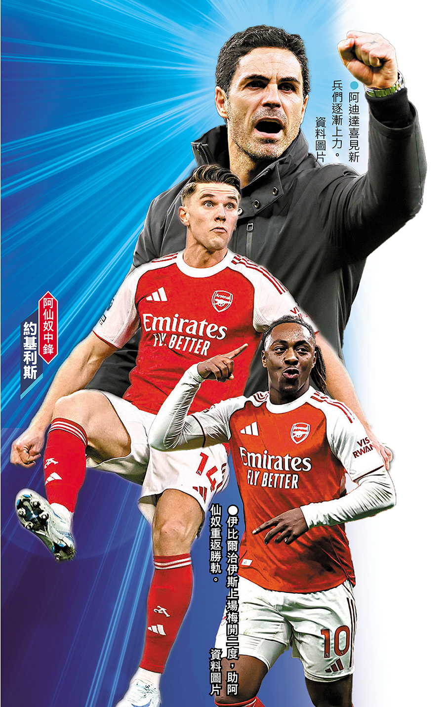 阿仙奴上場作客4:1大勝熱刺,在連續兩場聯賽失分後強勢反彈,證明球隊不會重蹈過往三季的覆轍,輕易被挫折影響爭標信心,心理質素明顯大幅改善。更值得主帥阿迪達高興的是,約基利斯及伊比爾治伊斯上仗雙雙梅開二度,兩名今季新援的狀態提升,令球隊兵源調動更見充裕。