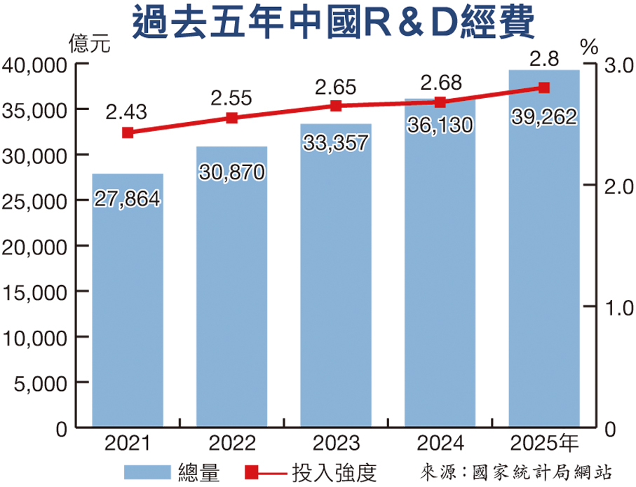 香港文匯報訊 綜合新華社、北京青年報及新浪財經報道,國家統計局2月28日公布《2025年國民經濟和社會發展統計公報》。公報顯示,2025年中國全社會研究與試驗發展(R&D)經費投入比上年增長8.1%,與GDP之比即R&D投入強度達2.8%,首次超過經濟合作與發展組織(OECD)國家平均水平。國家統計局副局長盛來運表示,我國科技硬實力穩步躍升。