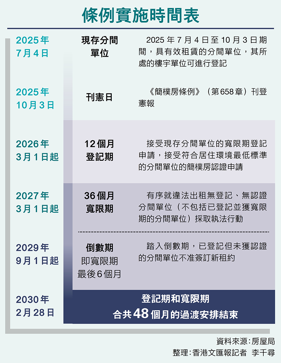 香港《簡樸房條例》今日實施,以全面有序地處理劣質劏房的「老大難」問題,特區政府房屋局副秘書長(特別職務)王明慧在接受香港文匯報訪問時表示,預計條例實施後俗稱劏房的分間單位市場供應及需求,不會即時有明顯起跌,因現時約11萬間劏房當中,僅約三成需要作較大幅度整改,以符合簡樸房標準。隨着公營房屋未來5年供應增加,約六成劏房住戶合資格申請,有望陸續「上樓」,劏房需求料逐步回落,政府並會透過6支服務隊支援受影響住戶,冀在48個月過渡期內平穩推進整改,逐步改善劣質劏房問題。 ●香港文匯報記者 李千尋