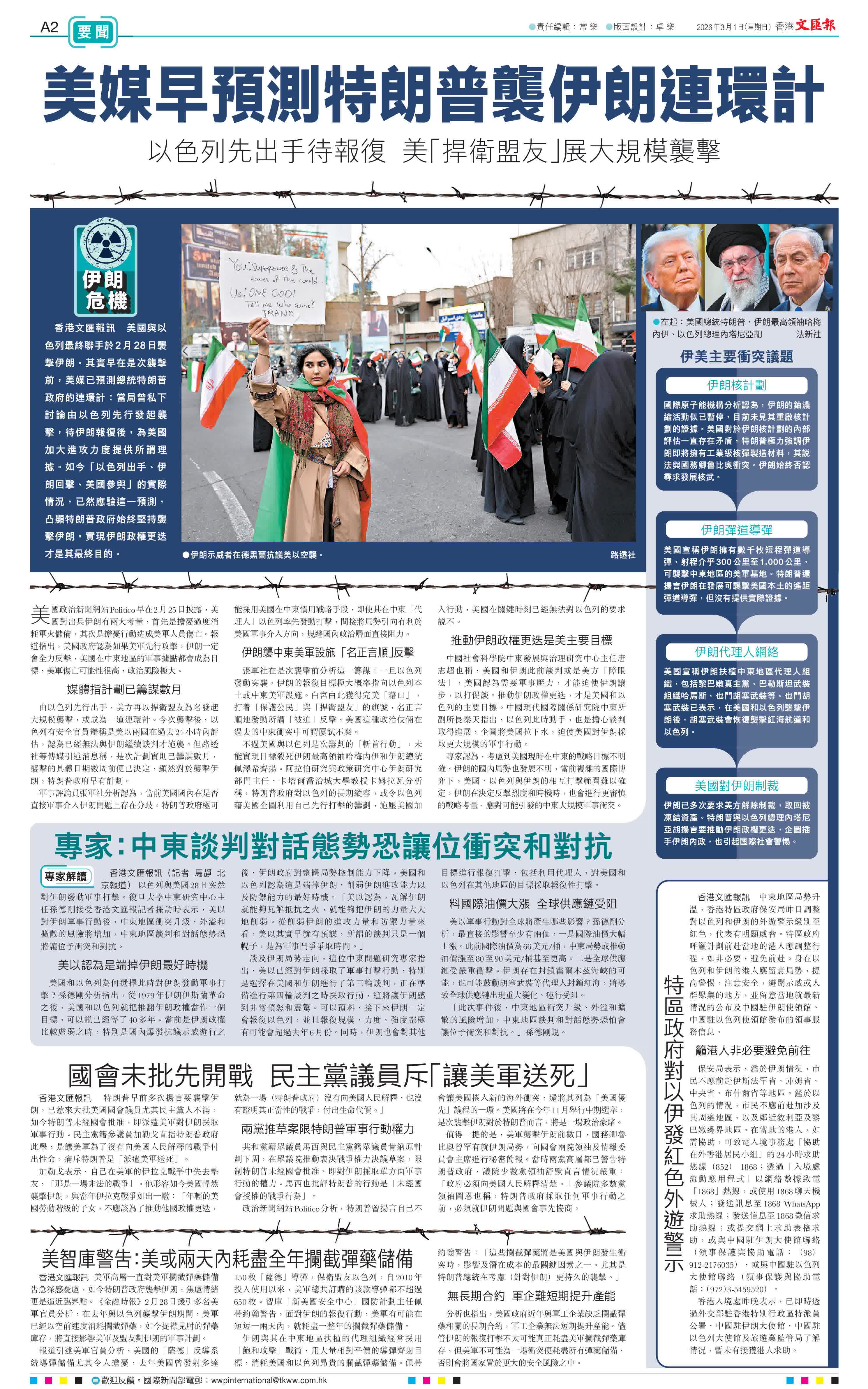 香港文匯報訊 美國與以色列最終聯手於2月28日襲擊伊朗。其實早在是次襲擊前,美媒已預測總統特朗普政府的連環計:當局曾私下討論由以色列先行發起襲擊,待伊朗報復後,為美國加大進攻力度提供所謂理據。如今「以色列出手、伊朗回擊、美國參與」的實際情況,已然應驗這一預測,凸顯特朗普政府始終堅持襲擊伊朗,實現伊朗政權更迭才是其最終目的。
