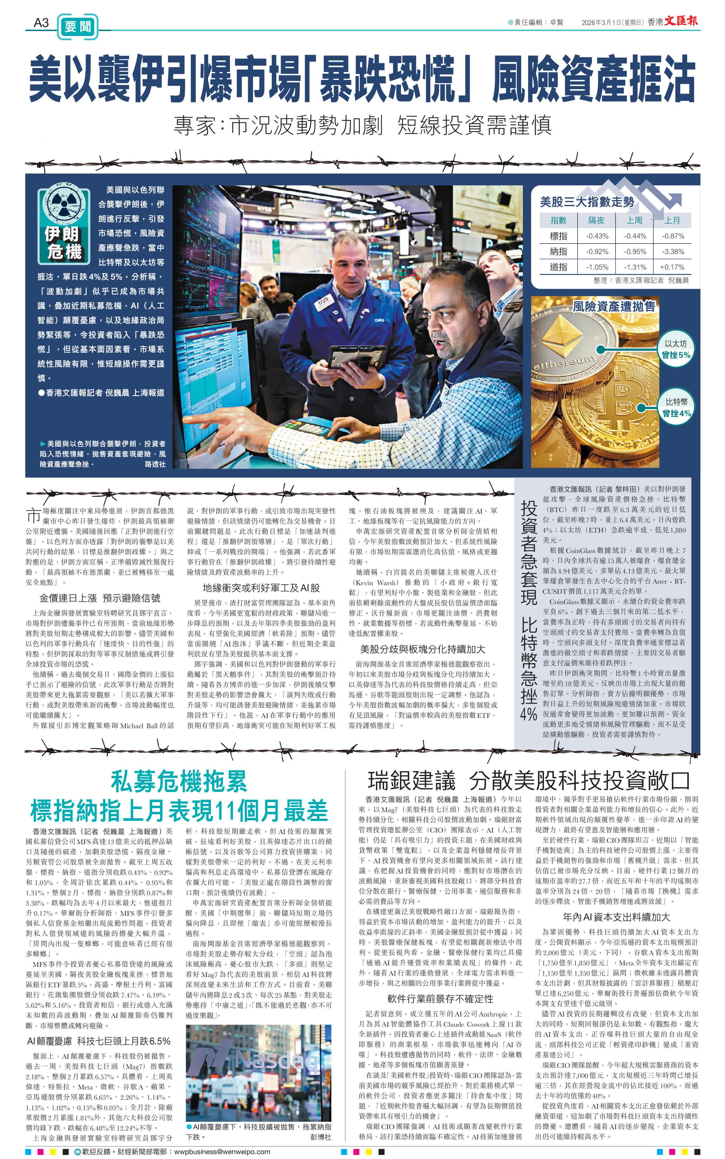 鄧宇強調,美國和以色列對伊朗發動的軍事行動屬於「黑天鵝事件」,其對美股的衝擊預計持續。隨着各方博弈的進一步加深,伊朗後續反擊對美股走勢的影響恐會擴大,「談判失敗或行動升級等,均可能誘發美股避險情緒,並拖累市場階段性下行」。他說,AI在軍事行動中的應用預期有望拉高,地緣衝突可能在短期利好軍工板塊,惟石油板塊將被殃及,建議關注AI、軍工、地緣板塊等有一定抗風險能力的方向。