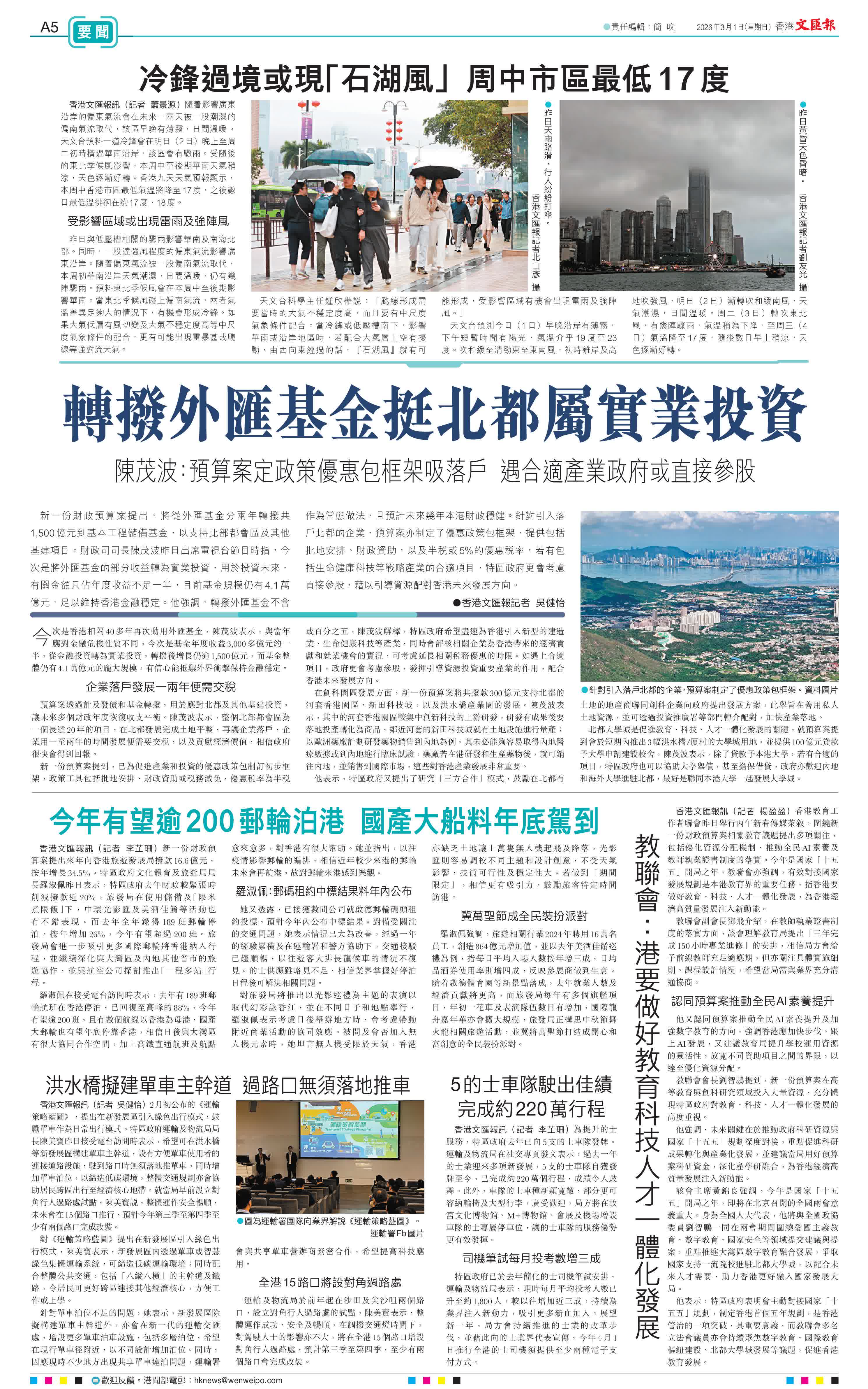天文台預測今日(1日)早晚沿岸有薄霧,下午短暫時間有陽光,氣溫介乎19度至23度。吹和緩至清勁東至東南風,初時離岸及高地吹強風,明日(2日)漸轉吹和緩南風,天氣潮濕,日間溫暖。周二(3日)轉吹東北風,有幾陣驟雨,氣溫稍為下降,至周三(4日)氣溫降至17度,隨後數日早上稍涼,天色逐漸好轉。