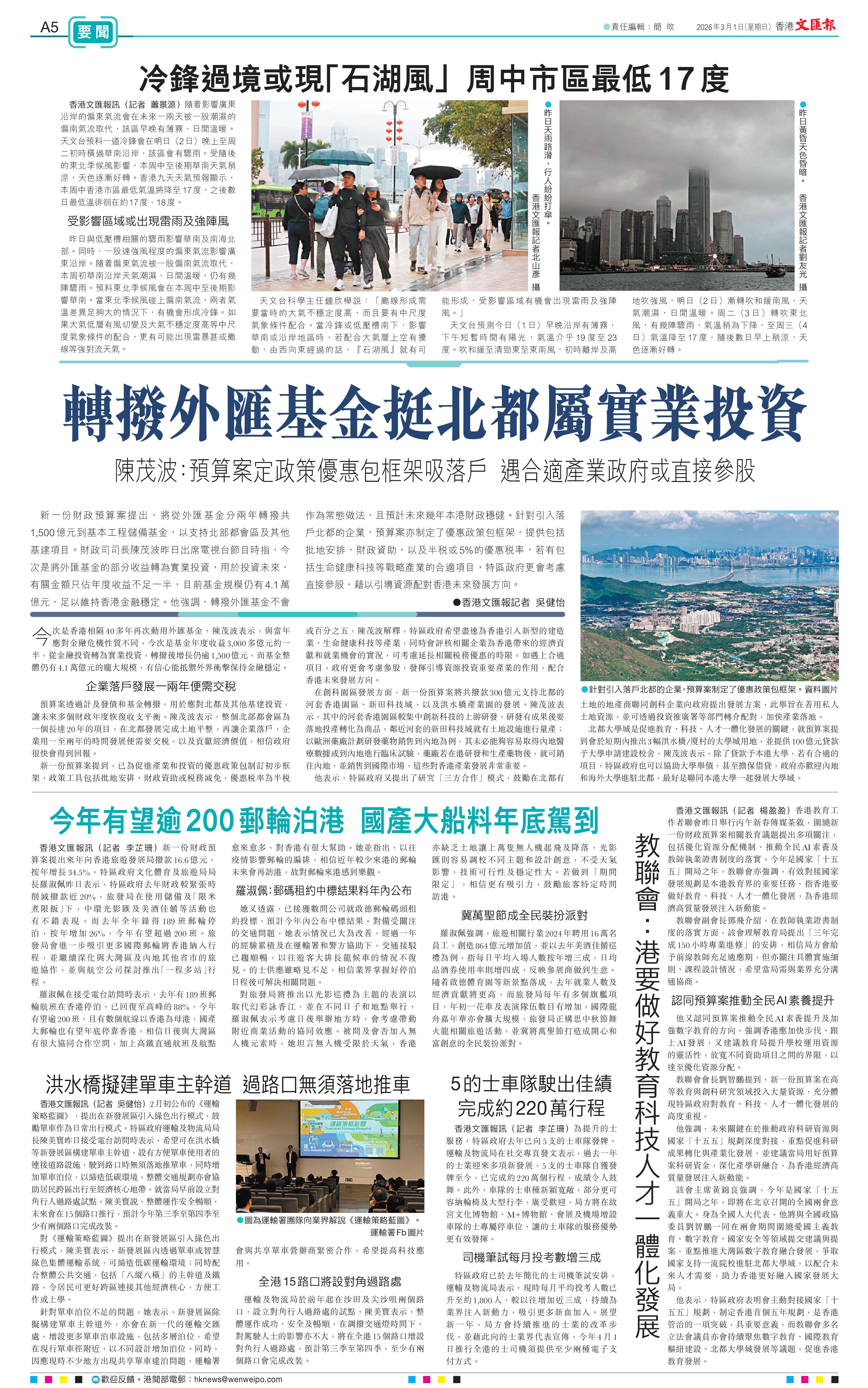 (香港文匯報記者 吳健怡)新一份財政預算案提出,將從外匯基金分兩年轉撥共1,500億元到基本工程儲備基金,以支持北部都會區及其他基建項目。財政司司長陳茂波昨日出席電視台節目時指,今次是將外匯基金的部分收益轉為實業投資,用於投資未來,有關金額只佔年度收益不足一半,目前基金規模仍有4.1萬億元,足以維持香港金融穩定。他強調,轉撥外匯基金不會作為常態做法,且預計未來幾年本港財政穩健。針對引入落戶北都的企業,預算案亦制定了優惠政策包框架,提供包括批地安排、財政資助,以及半稅或5%的優惠稅率,若有包括生命健康科技等戰略產業的合適項目,特區政府更會考慮直接參股,藉以引導資源配對香港未來發展方向。