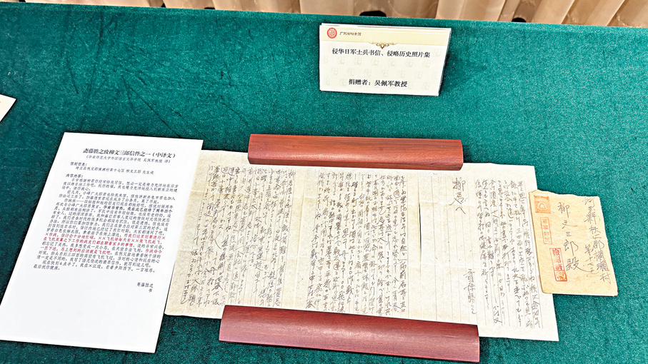 華南師範大學外國語言文化學院副教授吳佩軍捐贈的檔案,包括入侵華南的日軍士兵當年寄回日本並蓋有日軍軍事郵戳標記的手寫日文書信原件,反映了當時日軍在華南地區實施軍事侵略和推行奴化教育的具體罪行,是侵略者在未意識到自己將被追究侵略歷史罪責的狀態下,自發記錄留下的原始罪證,白紙黑字,不容抵賴。