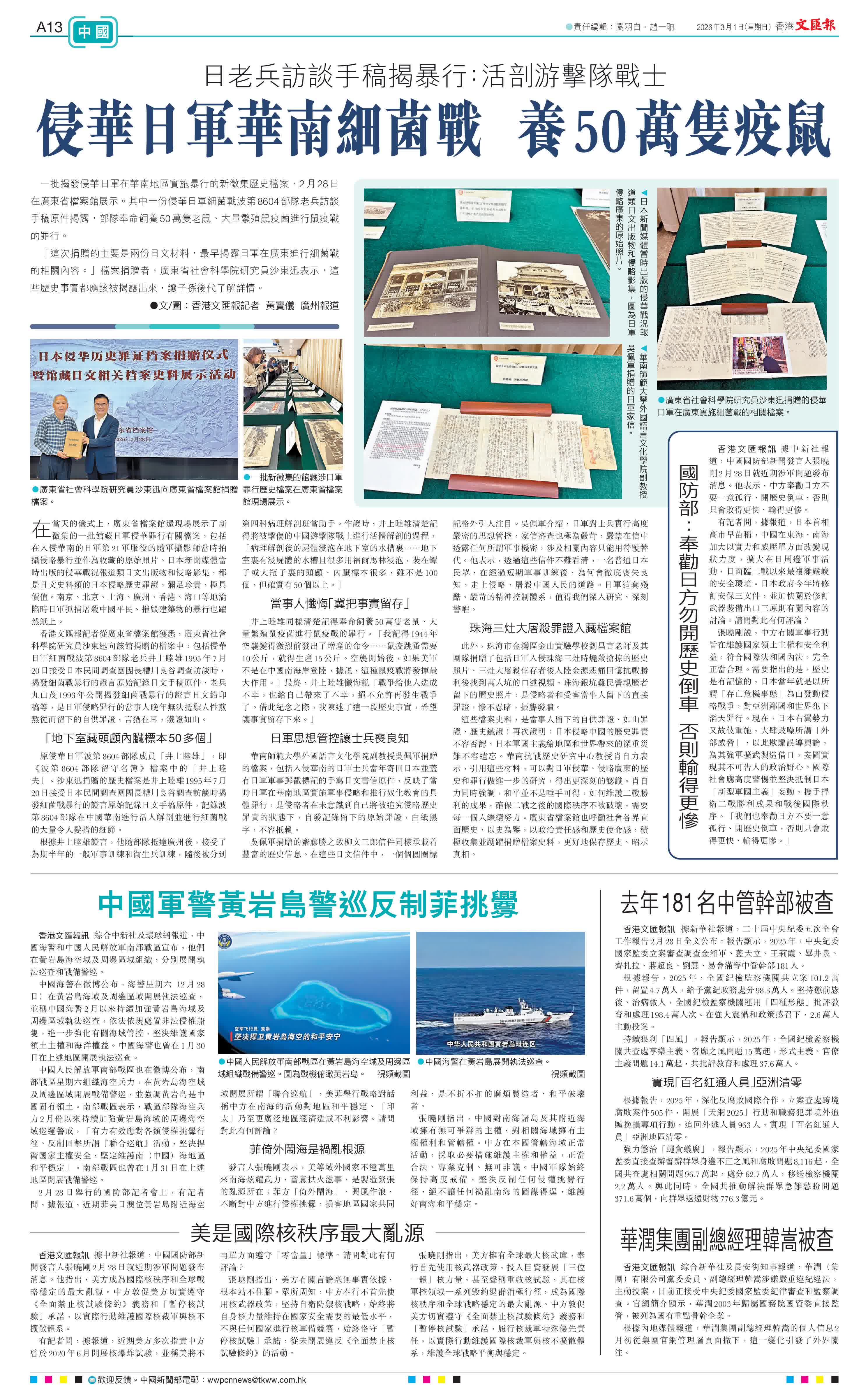 (文/圖:香港文匯報記者 黃寶儀 廣州報道)一批揭發侵華日軍在華南地區實施暴行的新徵集歷史檔案,2月28日在廣東省檔案館展示。其中一份侵華日軍細菌戰波第8604部隊老兵訪談手稿原件揭露,部隊奉命飼養50萬隻老鼠、大量繁殖鼠疫菌進行鼠疫戰的罪行。