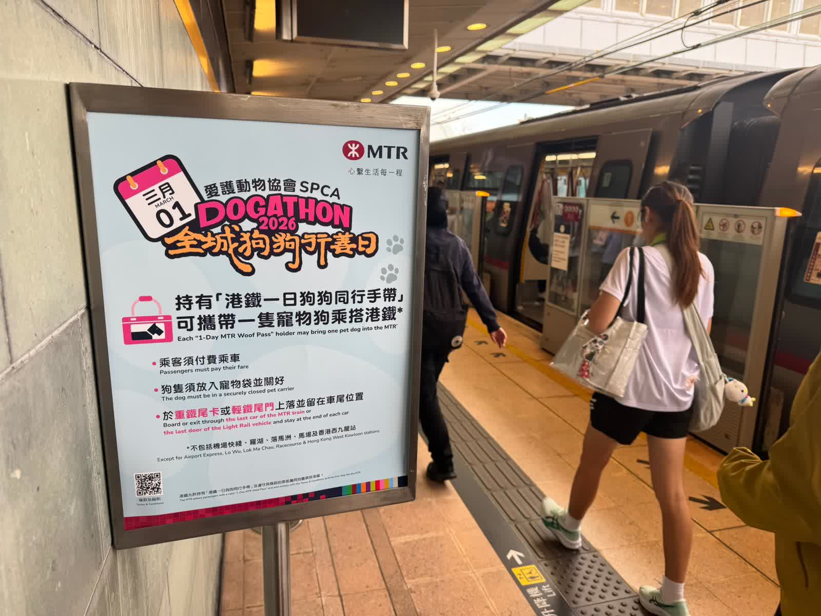 港鐵公司今年參與香港愛護動物協會(愛協)舉辦的「全城狗狗行善日2026」,首次開放重鐵網絡,提供1200個活動名額,供已登記及捐款的參加者取得「港鐵一日狗狗同行手帶」,每程可攜帶一隻寵物狗,乘搭港鐵重鐵路綫和輕鐵出行,使用次數不限。惟參加者必須遵守相關乘車規定,包括使用重鐵列車的尾卡及將寵物放入寵物袋等。