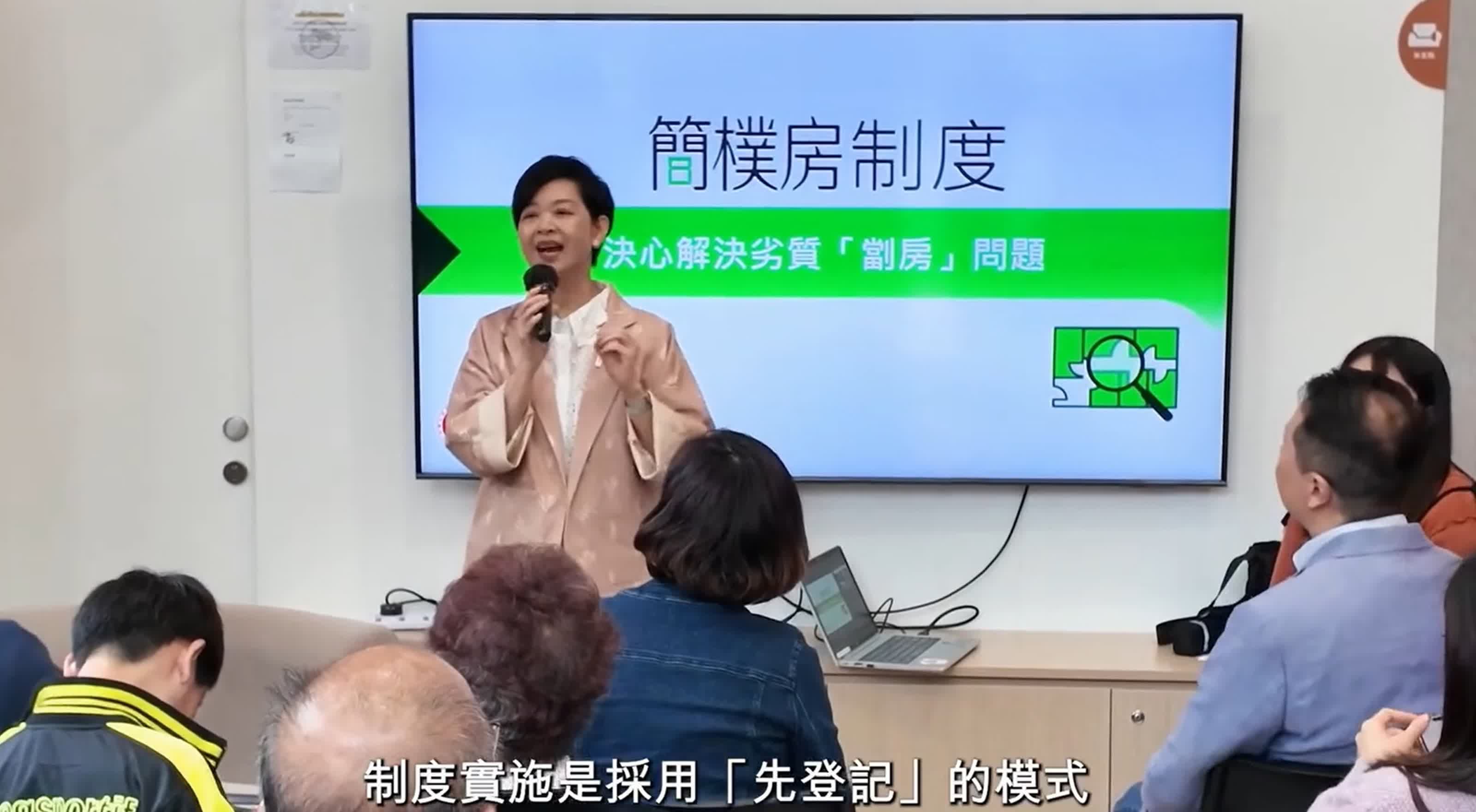 何永賢表示,今日她聯同立法會議員鄭泳舜和魏明德,及多位深水埗區議員到聖雅各福群會營運的南昌社區客廳,與分間單位住戶座談,向大家介紹簡樸房規管的內容,住戶的權益與保障。何永賢向居民介紹了未來傳統公營房屋供應大增,還有3萬個簡約公屋、2萬個過渡性房屋單位給合資格市民申請,希望給大家改善居住環境的選項;過渡性房屋更特設丙類申請,專供在簡樸房規管期間,因分間單位需要執整而受影響的租戶申請入住;當局共有6隊區域服務隊,專門支援分間單位住戶,有需要的街坊可按自己的地區聯繫他們。
