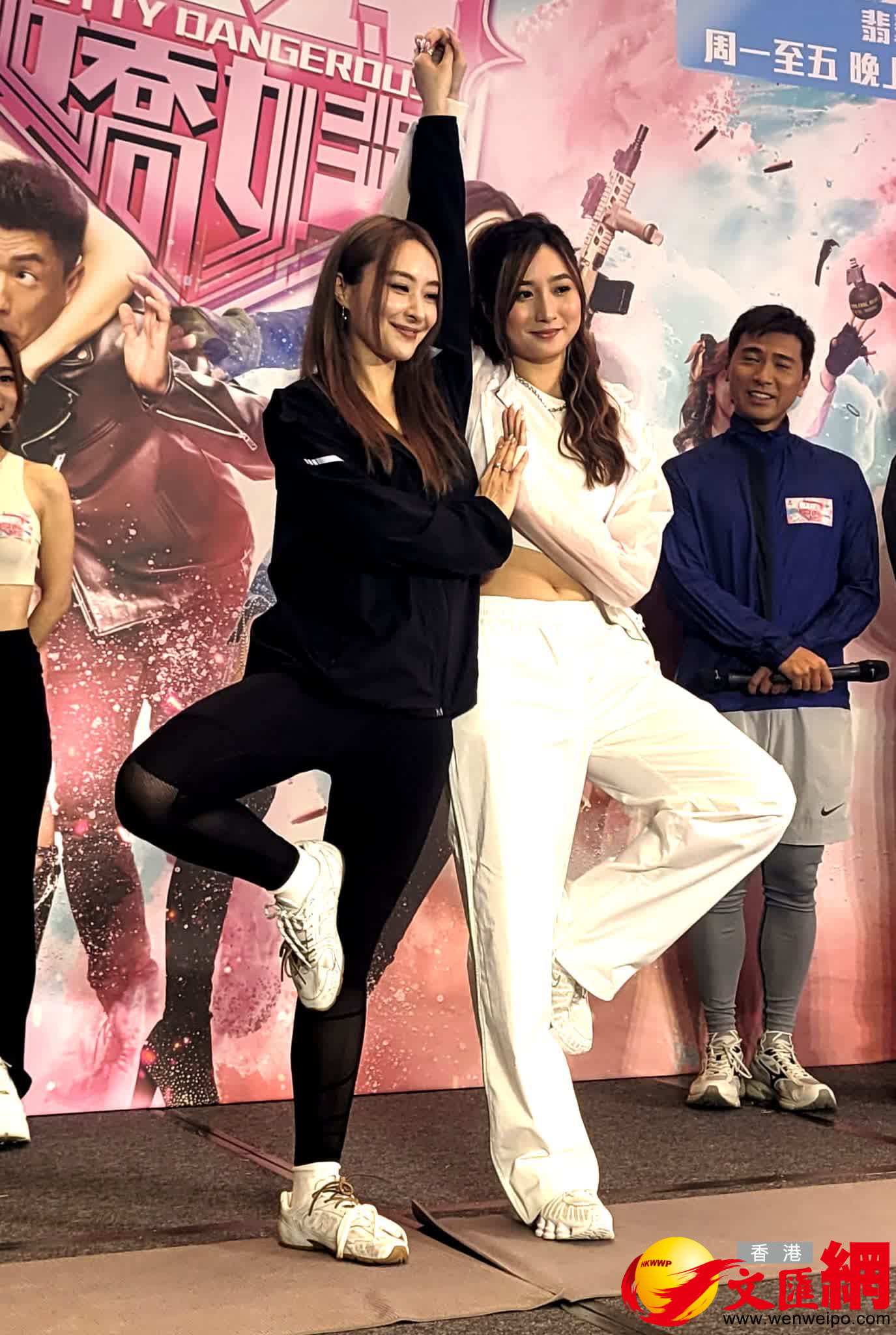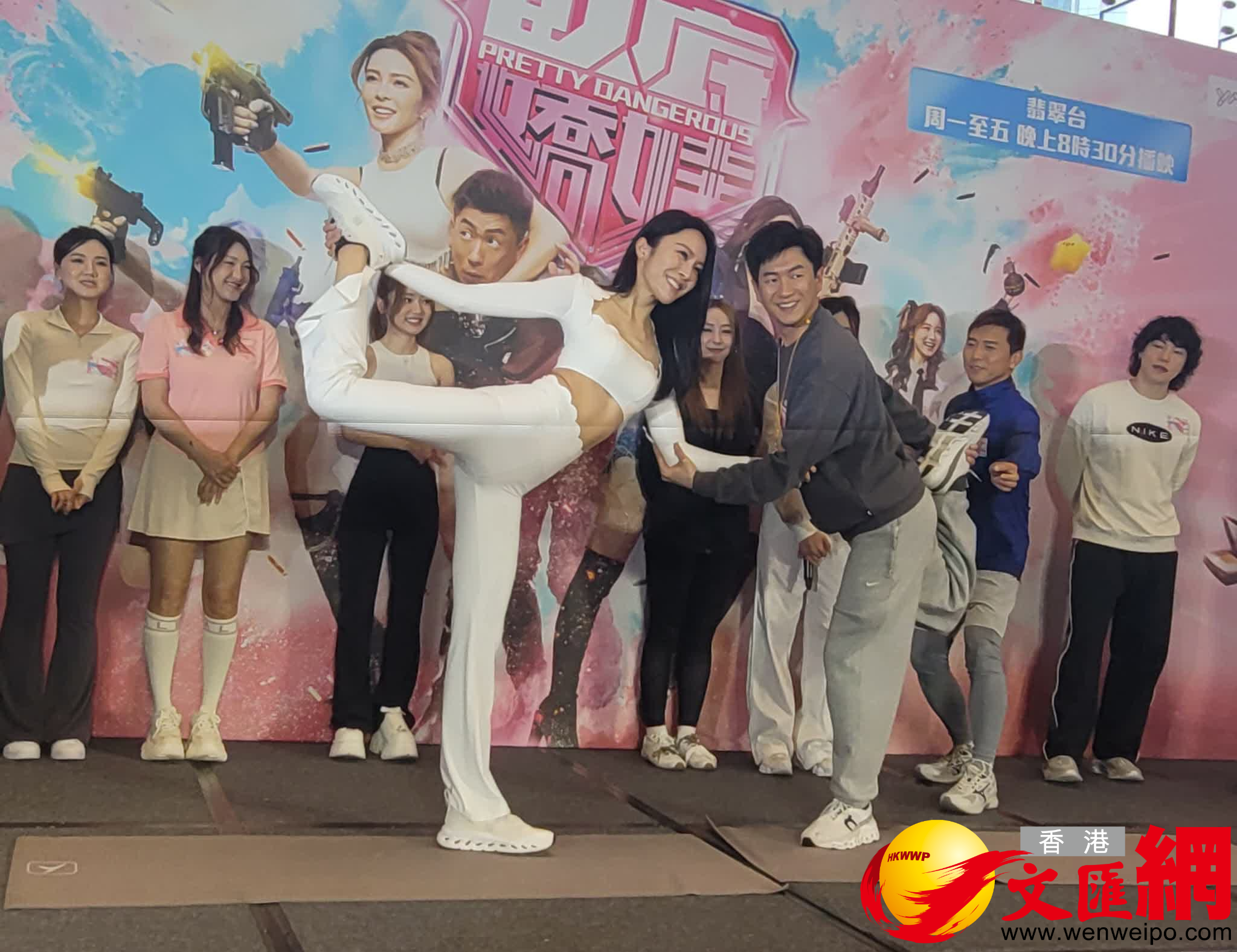 香港文匯報訊(記者 梁靜儀)馬貫東、張曦雯、陳瀅、羅毓儀、鍾柔美(Yumi)及黃子恒等,今日到觀塘出席《臥底嬌娃》宣傳活動,其中張曦雯、陳瀅、羅毓儀、Yumi更穿上性感瑜伽服亮相,並即場進行體能特訓,大騷打拳、抬腿踢木、搬車輪、戰繩等高難度瑜伽動作。