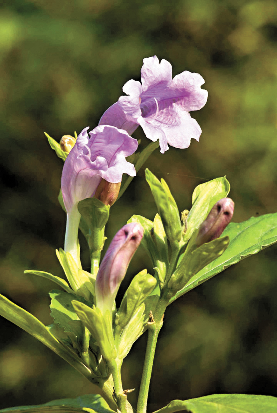馬藍疏生於野,根莖亭亭立着幾分清雅。葉片翠潤,對生而層疊舒展,波狀鋸齒緣間,脈絡藏着清冽生機,小小如喇叭形的藍紫色花朵聚生於頂端,煞是可愛。