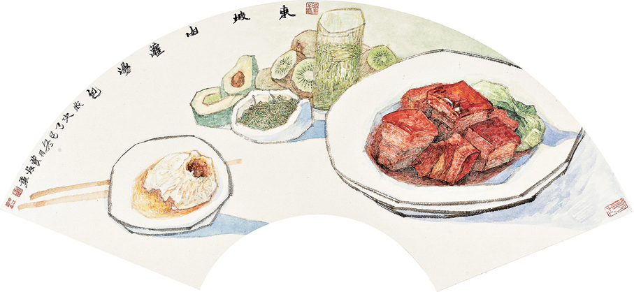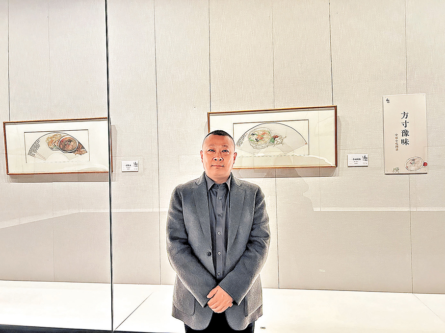 在賈發軍看來,美食「體量不大」的特質,與扇面的小空間有着天然的內在契合,這讓他能對每一種食材、每一道菜餚進行更深入、精緻的刻畫。創作中,他在寫實的基礎上兼顧色調運用與食材肌理表現,力求「形神兼備」:畫燴麵時,悉心勾勒湯汁的通透與潤澤,讓觀者彷彿能感受到那一碗燴麵的溫熱;繪燒鵝時,精準捕捉表皮的油亮質感,盡顯粵菜的風味特色。構圖上,60餘幅作品更是無一雷同,讓小小的扇面充滿了視覺張力。