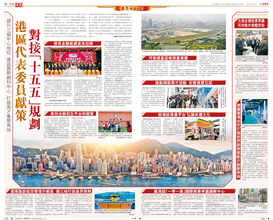 中國共產黨二十屆四中全會2025年10月23日通過《中共中央關於制定國民經濟和社會發展第十五個五年規劃的建議》(「十五五」規劃建議)。「十五五」規劃建議明確支持港澳更好融入和服務國家發展大局,加強港澳與內地經貿、科技、人文等合作,完善便利港澳居民在內地發展和生活政策措施。發揮港澳背靠祖國、聯通世界獨特優勢和重要作用,鞏固提升香港國際金融、航運、貿易中心地位,支持香港建設國際創新科技中心,支持港澳打造國際高端人才集聚高地。