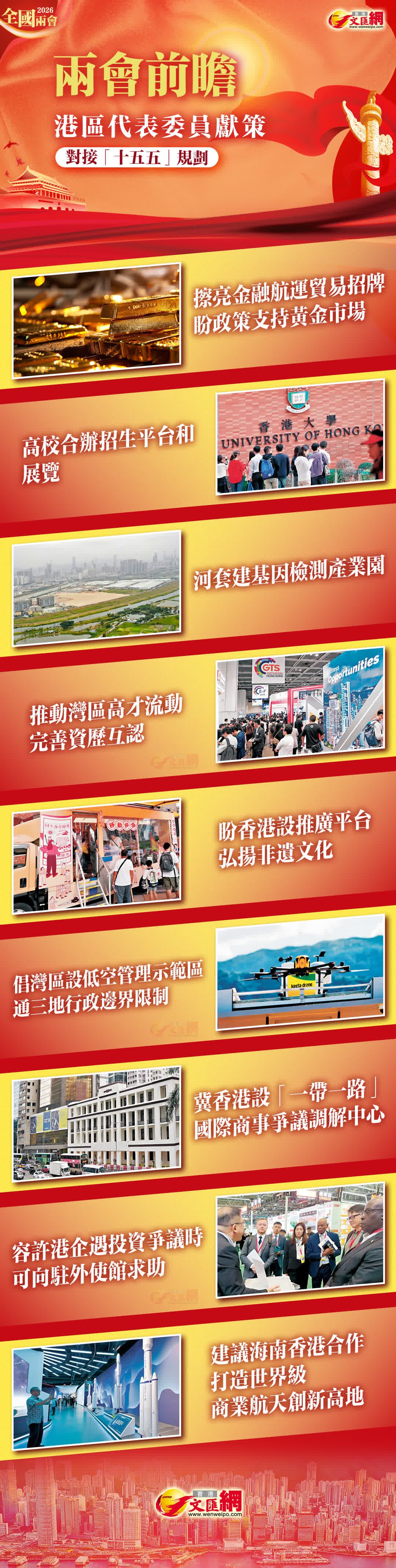 港區全國人大代表黃錦良建議國家支持內地「雙一流」高校,尤其是航空航天、人工智能等戰略緊缺領域的院系進駐北部都會區,整合兩地教研資源;以北部都會區為試點,推動大灣區高端人才跨境流動、完善高教資歷互認,深化「香港研發、內地轉化」模式,將北都大學城打造成為服務國家戰略的國際高端人才港、科技創新策源地及大灣區產教融合示範區,為國家科技自立自強提供堅實支撐。