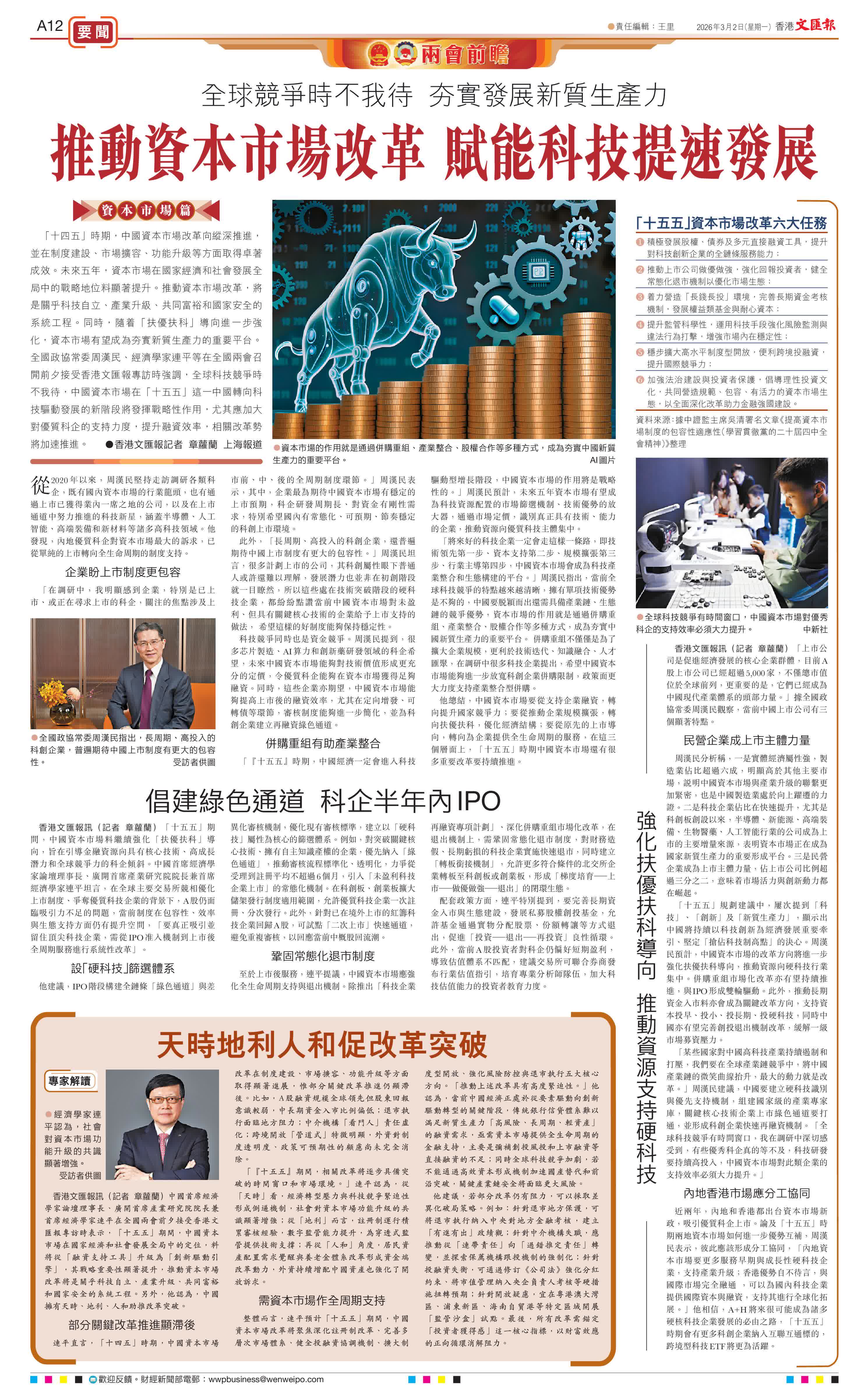 (香港文匯報記者 章蘿蘭 上海報道)「十四五」時期,中國資本市場改革向縱深推進,並在制度建設、市場擴容、功能升級等方面取得卓著成效。未來五年,資本市場在國家經濟和社會發展全局中的戰略地位料顯著提升。推動資本市場改革,將是關乎科技自立、產業升級、共同富裕和國家安全的系統工程。同時,隨着「扶優扶科」導向進一步強化,資本市場有望成為夯實新質生產力的重要平台。全國政協常委周漢民、經濟學家連平等在全國兩會召開前夕接受香港文匯報專訪時強調,全球科技競爭時不我待,中國資本市場在「十五五」這一中國轉向科技驅動發展的新階段將發揮戰略性作用,尤其應加大對優質科企的支持力度,提升融資效率,相關改革勢將加速推進。