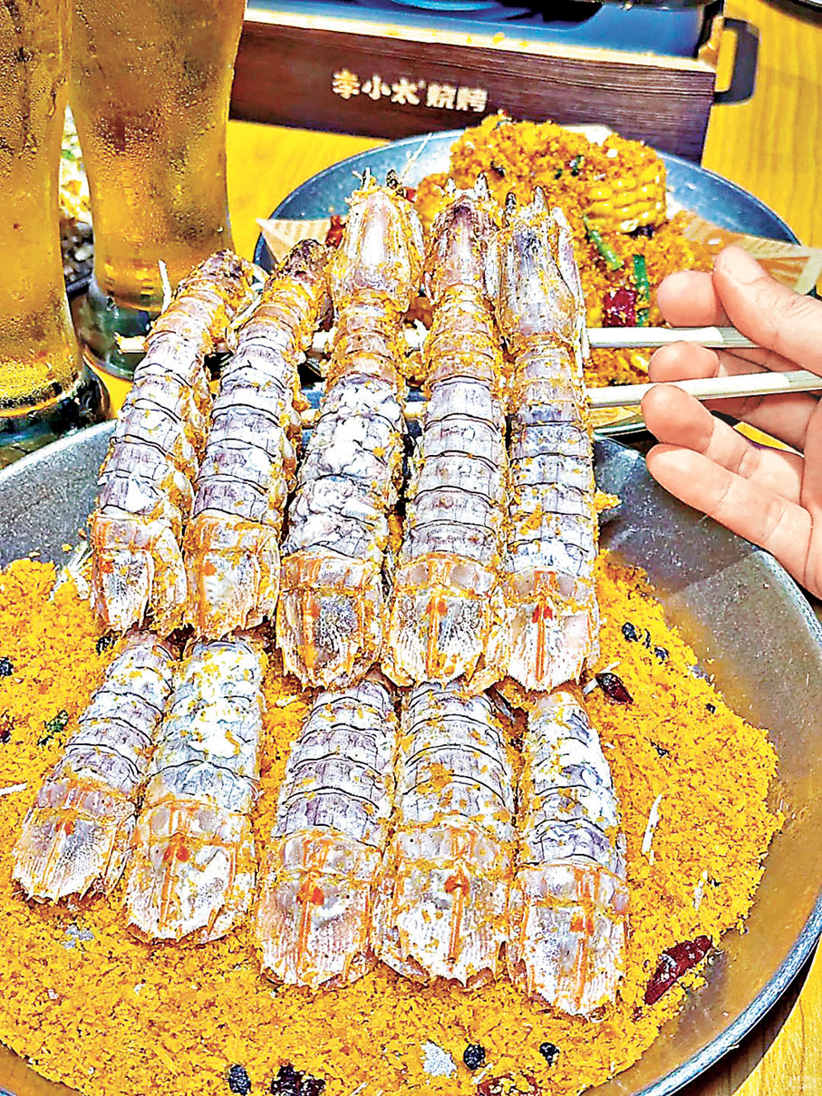 美食方面,¥23已有4串「爆汁牛肉」,全是新鮮現切並以炭火現烤牛肉,香味四溢,外焦內嫩,咬下去瞬間肉汁大爆發,「食肉獸」難以停口。¥39的「炭烤活鰻」一份雖然僅5件,但鰻魚現撈現烤,肉質厚實多汁外皮焦脆,搭配秘製醬料亦是必食之選。至於大大碟的「烤茄子」(¥12),茄子與蒜蓉醬汁完美融合,每口都是精華,重口味人士最愛。此外,其他必食海鮮有「古法香煎黃花魚」(¥49)、還有「椒鹽皮皮蝦」(瀨尿蝦),每隻超大件僅¥19(兩串起)。砂鍋粥方面,要嘗嘗「海蝦瑤柱砂鍋粥」(¥69),海蝦分量超多,粥底以新鮮海蝦與瑤柱煲成,鮮甜濃郁,米粒煮得滑而不黏,值得一試。