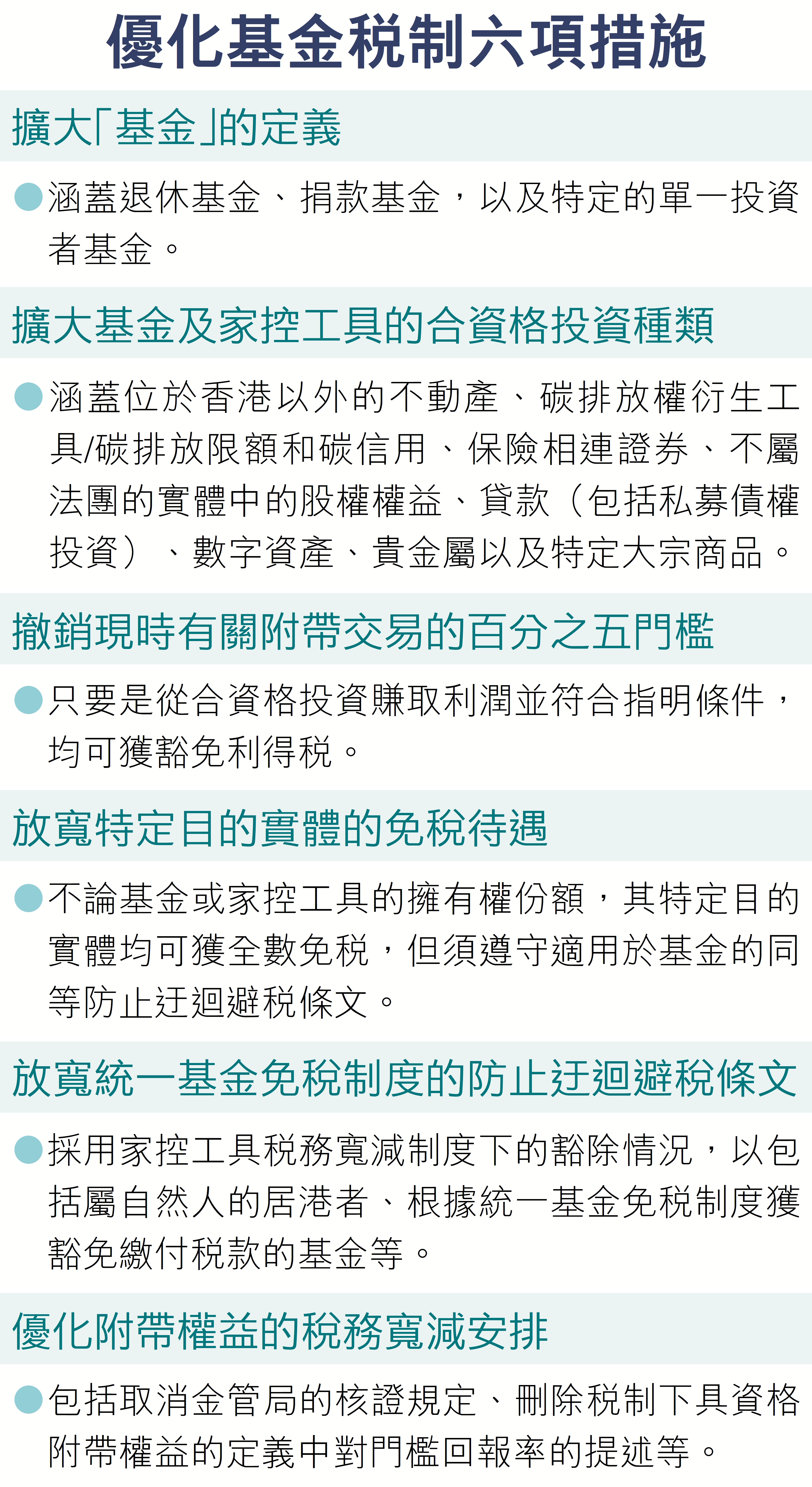 六方面措施(詳見附表)其中包括:擴大「基金」的定義,以涵蓋退休基金、捐款基金,以及特定的單一投資者基金,以便利更多種類的基金使用免稅制度和吸引具規模的單一投資者。當局建議擴大基金及家控工具的合資格投資種類,旨在與政府在相關領域的政策如推廣碳交易、數字資產,以及貴金屬與大宗商品交易等,起相輔相成的作用。當局又建議撤銷現時有關附帶交易的5%門檻,讓基金、家控工具及其特定目的實體在透過合資格投資賺取利潤(例如通過利息收入)方面享有更大彈性。