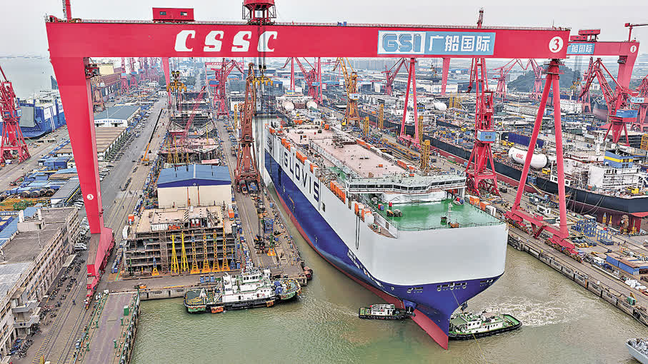 全球最大汽車運輸船今年1月在廣州出塢。中船廣船國際為韓國HMM公司建造的「10800車LNG雙燃料汽車運輸船(PCTC)」,單船最大載車量可達10,800輛。中船廣船國際相關負責人表示,該船順利出塢,標誌着廣船國際在高端清潔能源船舶建造領域取得重大突破。