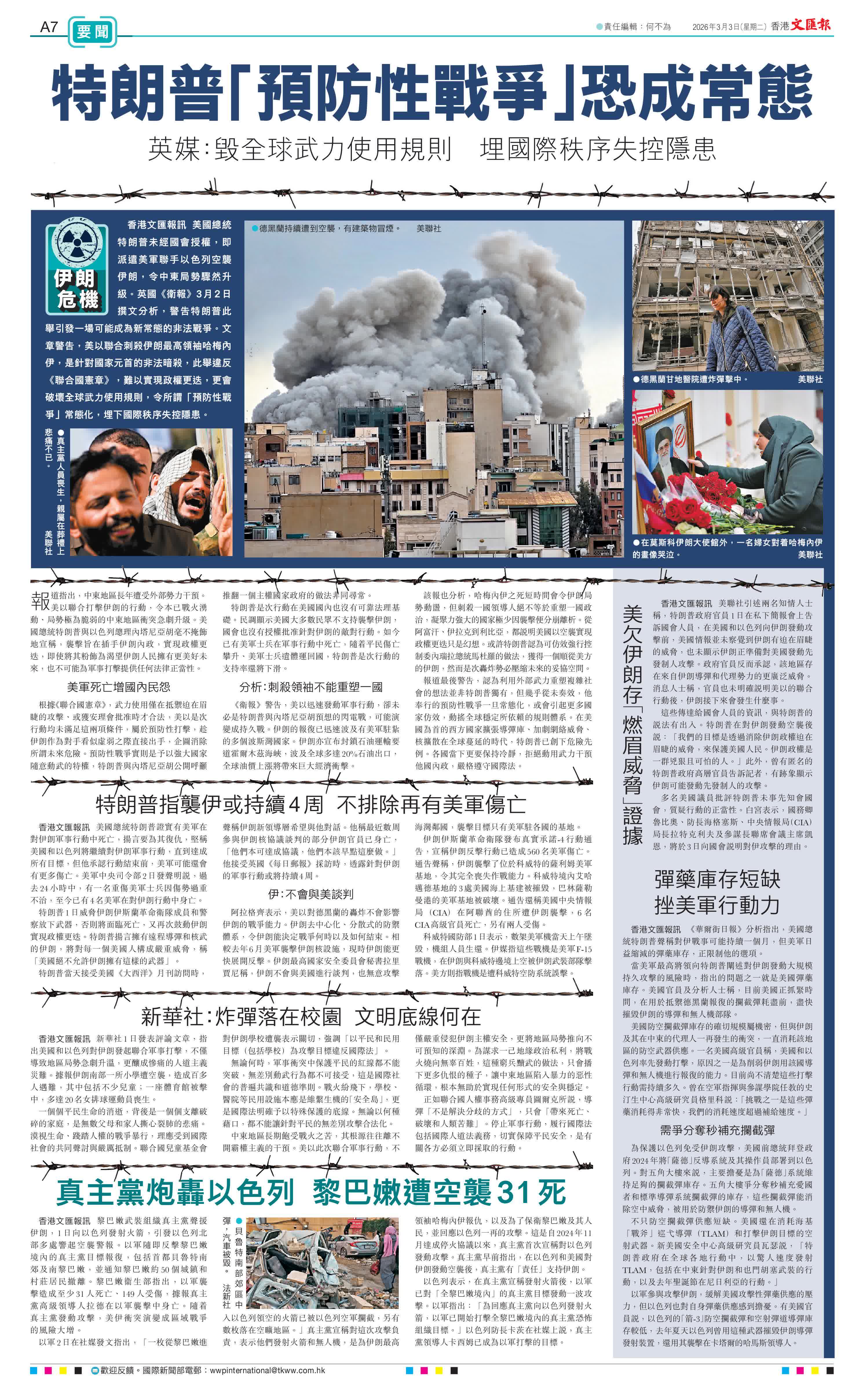 香港文匯報訊 美國總統特朗普未經國會授權,即派遣美軍聯手以色列空襲伊朗,令中東局勢驟然升級。英國《衛報》3月2日撰文分析,警告特朗普此舉引發一場可能成為新常態的非法戰爭。文章警告,美以聯合刺殺伊朗最高領袖哈梅內伊,是針對國家元首的非法暗殺,此舉違反《聯合國憲章》,難以實現政權更迭,更會破壞全球武力使用規則,令所謂「預防性戰爭」常態化,埋下國際秩序失控隱患。