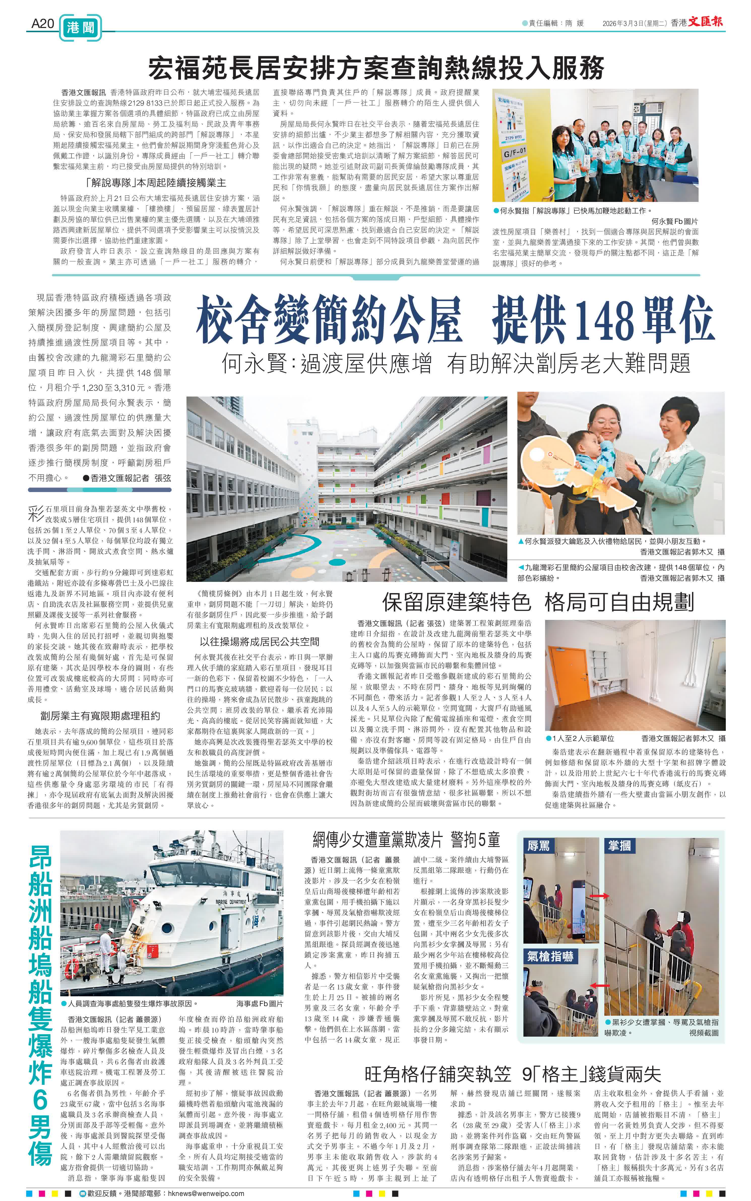 (香港文匯報記者 張弦)現屆香港特區政府積極透過各項政策解決困擾多年的房屋問題,包括引入簡樸房登記制度、興建簡約公屋及持續推進過渡性房屋項目等。其中,由舊校舍改建的九龍灣彩石里簡約公屋項目昨日入伙,共提供148個單位,月租介乎1,230至3,310元。香港特區政府房屋局局長何永賢表示,簡約公屋、過渡性房屋單位的供應量大增,讓政府有底氣去面對及解決困擾香港很多年的劏房問題,並指政府會逐步推行簡樸房制度,呼籲劏房租戶不用擔心。