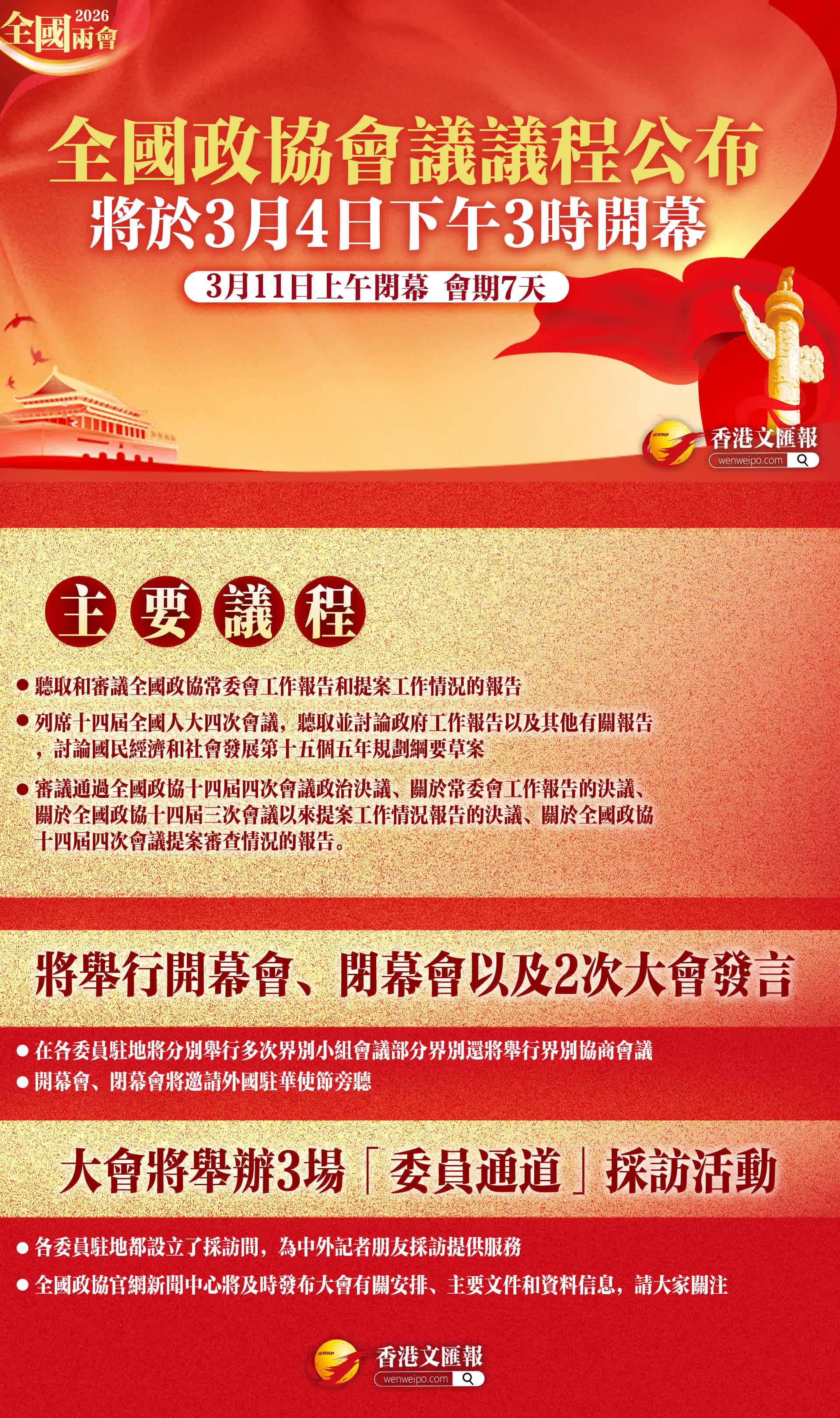大會新聞發言人劉結一介紹,大會期間,將舉行開幕會、閉幕會以及2次大會發言;在各委員駐地將分別舉行多次界別小組會議,部分界別還將舉行界別協商會議。開幕會、閉幕會將邀請外國駐華使節旁聽。