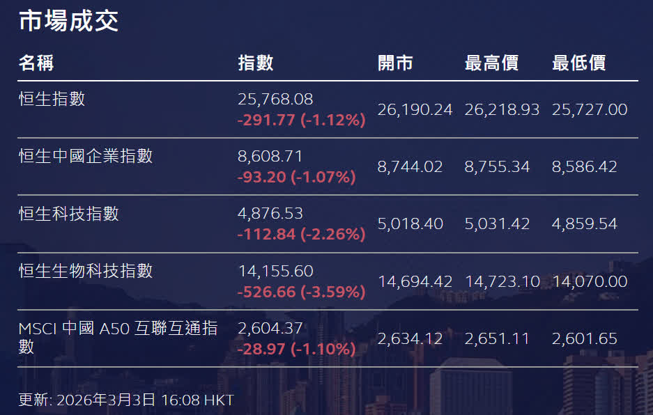香港文匯報訊 中東緊張局勢持續,亞太區股市今日繼續普遍下挫,市場風險胃納明顯收縮,三大指數齊低收。恒生指數(恒指)收報25,768點,全日跌291點或1.12%;國企指數跌1.07%;恒生科技指數跌2.26%。大市成交約3,705.5億元,連續兩日逾3,500億元,並較周一約3,576.8億元進一步增加。