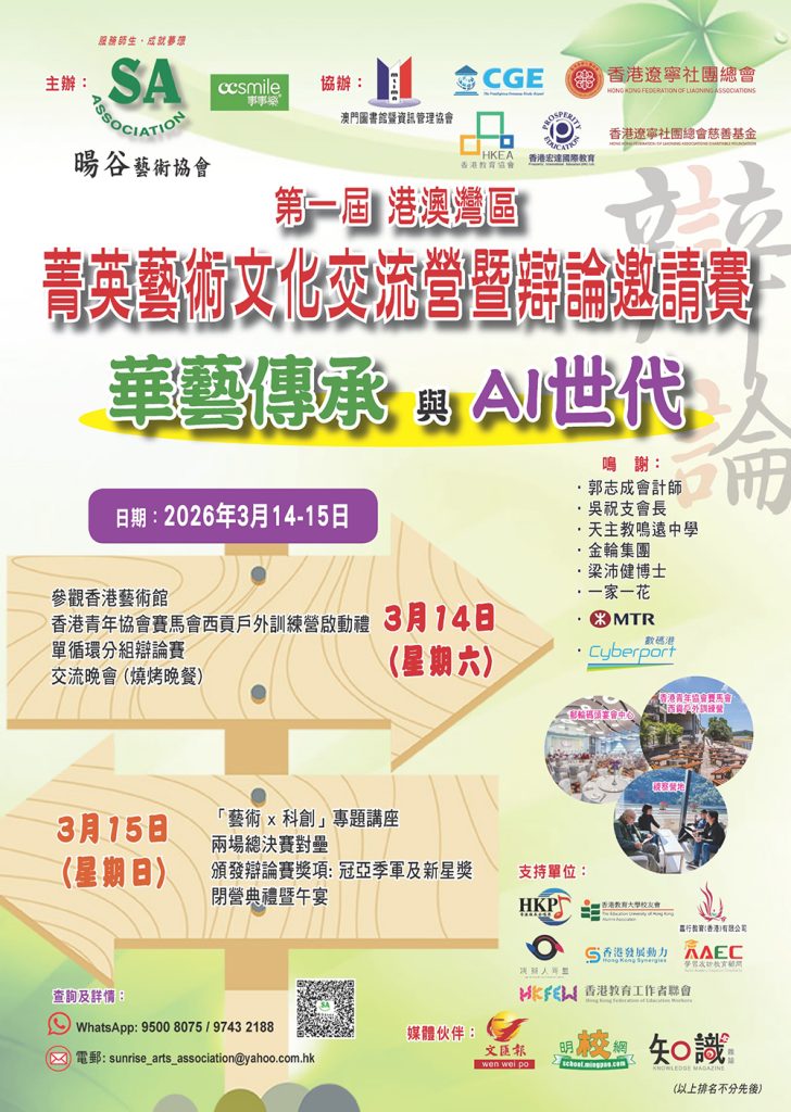 香港文匯報訊 「第一屆港澳灣區菁英藝術文化交流營暨辯論邀請賽」將於本月14日至15日在香港舉行。活動以「華藝傳承與AI世代」為主題,將邀請粵港澳大灣區內共12所中學參與,逾百名師生代表雲集香江,展開為期2日1夜的深度交流之旅,共同展開一場融合藝術、科技與思辨的深度交流。