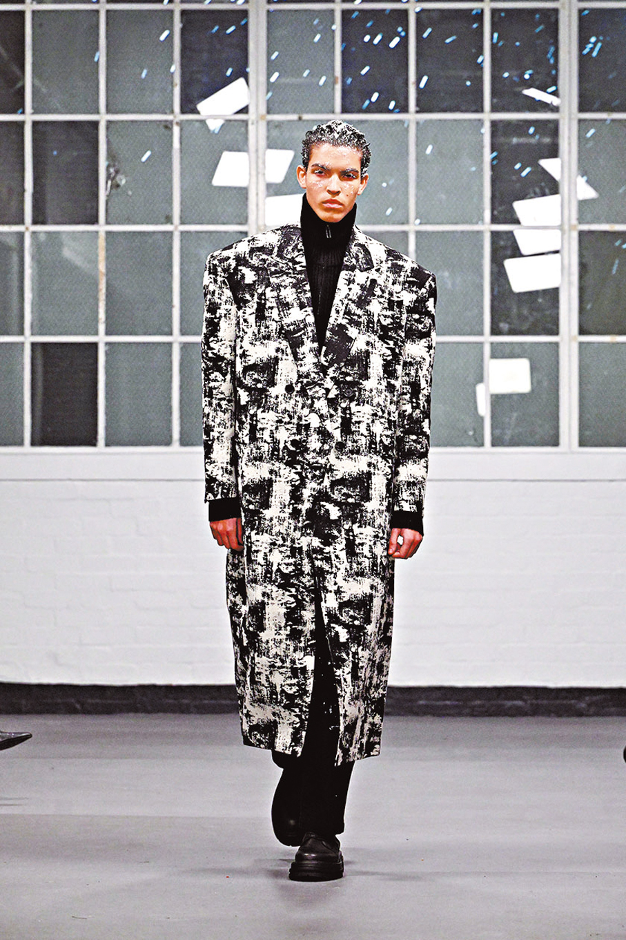 黃梓維以其前衛風格與簡約結構的創新設計聞名,作品着重剪裁與結構,展現低調而內斂的美學,同時兼顧貼合度與穿着舒適性。他的設計將藝術與品味融入消費者生活,致力於提供高品質且價格合理的服裝。今次展示品牌HARRISON WONG「Midnight Snowfall」系列,他分享說:「我以無星夜幕下飄雪的靜謐詩意為靈感,黑白漸變紋理如雪片墜落,密集白斑逐漸暈染至墨色丹寧與羊毛;格紋疊加雪花質感,營造細膩的節奏與層次。」系列的解構式剪裁融合當代男裝與隱約的運動元素,以混合結構與寬鬆廓形呈現都市中的優雅與從容。整體以大膽而內斂的單色美學貫穿,在冬日的寧靜中遊走於結構與玩味、經典與當代之間。