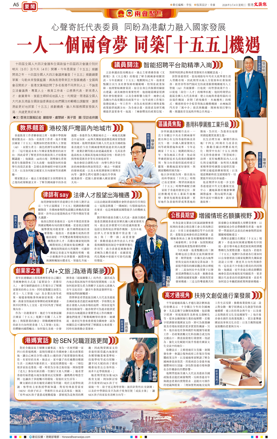 十四屆全國人大四次會議和全國政協十四屆四次會議分別於明天(5日)及今天(4日)開幕。今年是國家「十五五」規劃開局之年,十四屆全國人大四次會議將審查「十五五」規劃綱要草案,勾勒未來發展藍圖,將為香港帶來巨大發展機遇。全國兩會召開前夕,香港文匯報訪問了多名香港不同界別人士,不論是立法會議員、專業人士、教育工作者、公務員代表、新來港人才、創業青年、家庭主婦抑或地區人士,均期望一眾港區全國人大代表及港區全國政協委員能在他們關注的範疇出謀獻策,讓香港能更好地抓緊「十五五」規劃機遇,融入和服務國家發展大局,共建更美好未來。