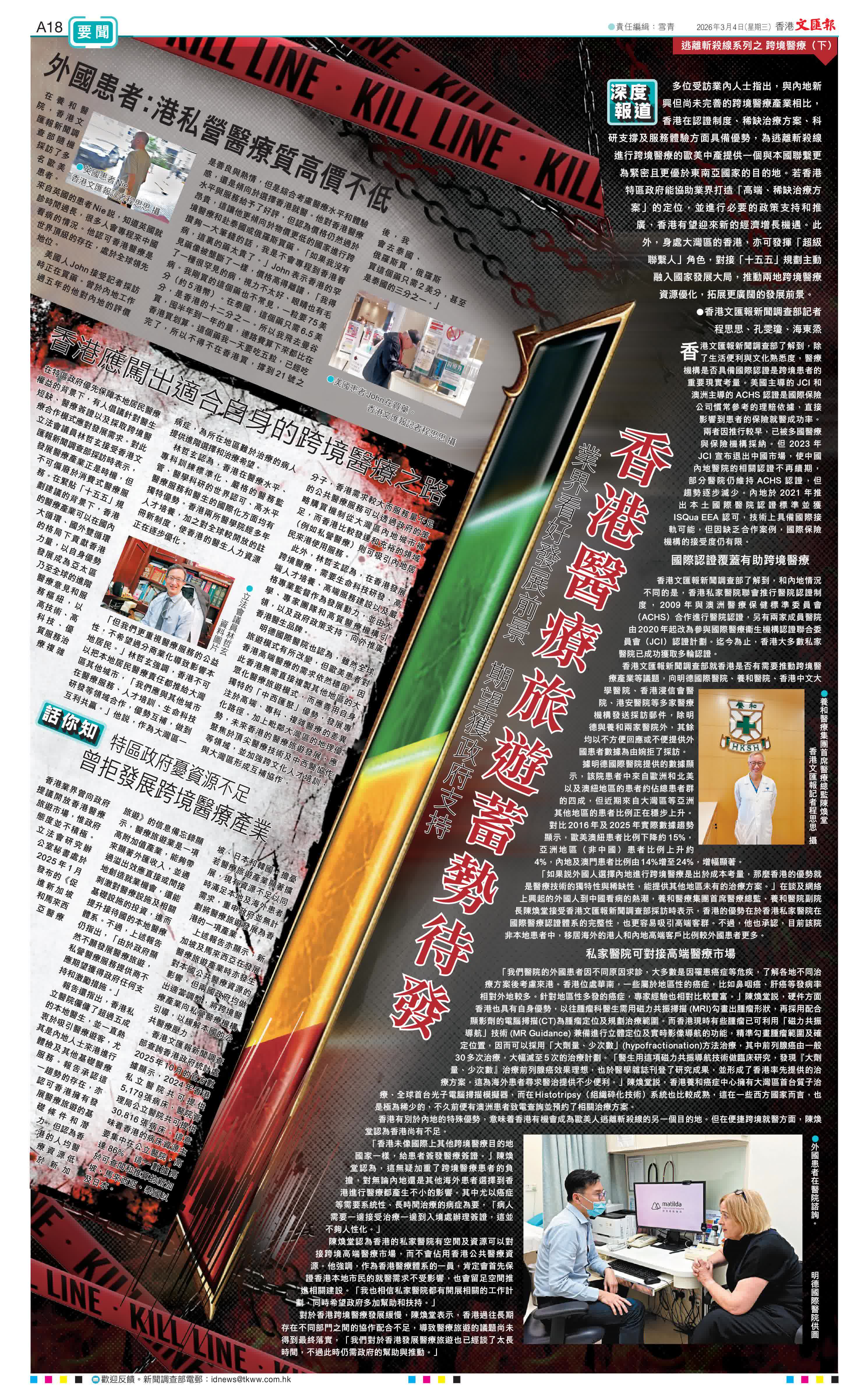 (香港文匯報新聞調查部記者 程思思、孔雯瓊、海東烝)多位受訪業內人士指出,與內地新興但尚未完善的跨境醫療產業相比,香港在認證制度、稀缺治療方案、科研支撐及服務體驗方面具備優勢,為逃離斬殺線進行跨境醫療的歐美中產提供一個與本國聯繫更為緊密且更優於東南亞國家的目的地。若香港特區政府能協助業界打造「高端、稀缺治療方案」的定位,並進行必要的政策支持和推廣,香港有望迎來新的經濟增長機遇。此外,身處大灣區的香港,亦可發揮「超級聯繫人」角色,對接「十五五」規劃主動融入國家發展大局,推動兩地跨境醫療資源優化,拓展更廣闊的發展前景。