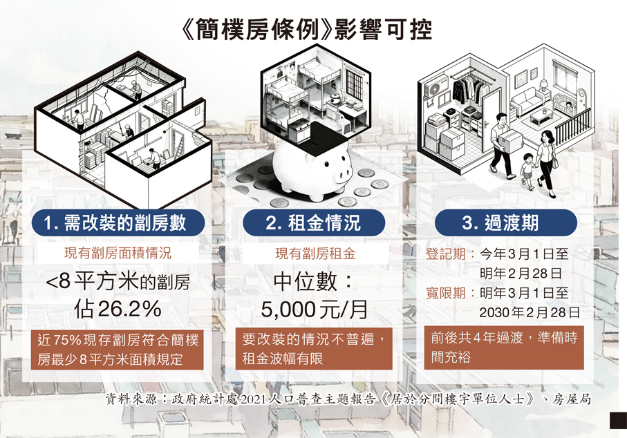 至於另有意見指出,簡樸房制度落實,業主需投資改建,經營成本或會大增,擔心因此影響分間單位的供應或租金;其實,政府推出簡樸房制度之前已進行詳細的市場調查。現時本港約11萬間劏房中,僅約三成需要作較大幅度整改(主要因面積未達8平方米的最低標準),其餘約七成只需較小改動,如更換防火門、加裝消防偵測器等,工程相對簡單,業主較易完成認證。相信絕大部分單位能夠輕鬆過渡至「簡樸房」,市場供應不會即時斷崖式下跌,有需要的居民不會流離失所,租金亦不會因此而暴升。