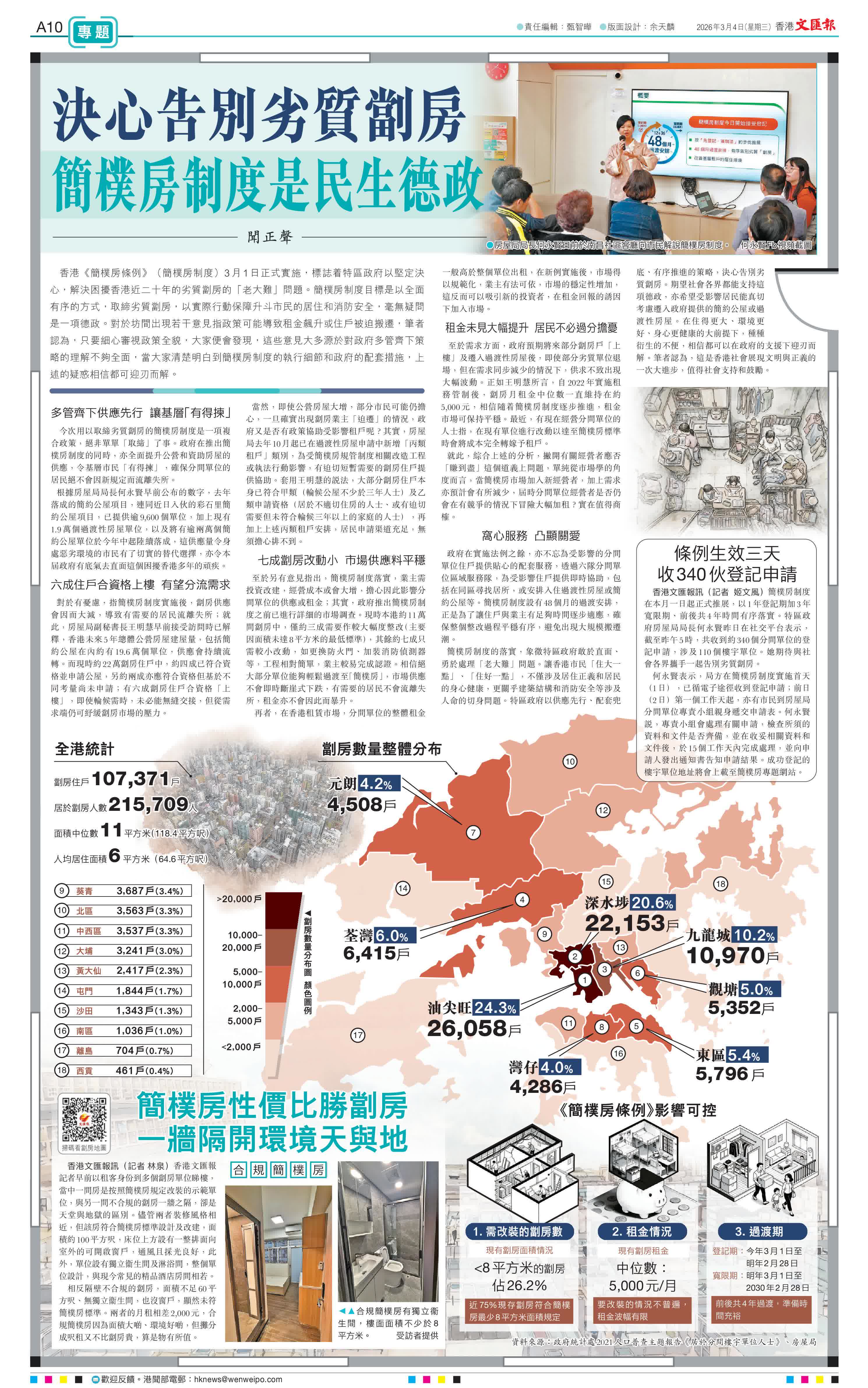 (文:聞正聲)香港《簡樸房條例》(簡樸房制度)3月1日正式實施,標誌着特區政府以堅定決心,解決困擾香港近二十年的劣質劏房的「老大難」問題。簡樸房制度目標是以全面有序的方式,取締劣質劏房,以實際行動保障升斗市民的居住和消防安全,毫無疑問是一項德政。對於坊間出現若干意見指政策可能導致租金飆升或住戶被迫搬遷,筆者認為,只要細心審視政策全貌,大家便會發現,這些意見大多源於對政府多管齊下策略的理解不夠全面,當大家清楚明白到簡樸房制度的執行細節和政府的配套措施,上述的疑惑相信都可迎刃而解。