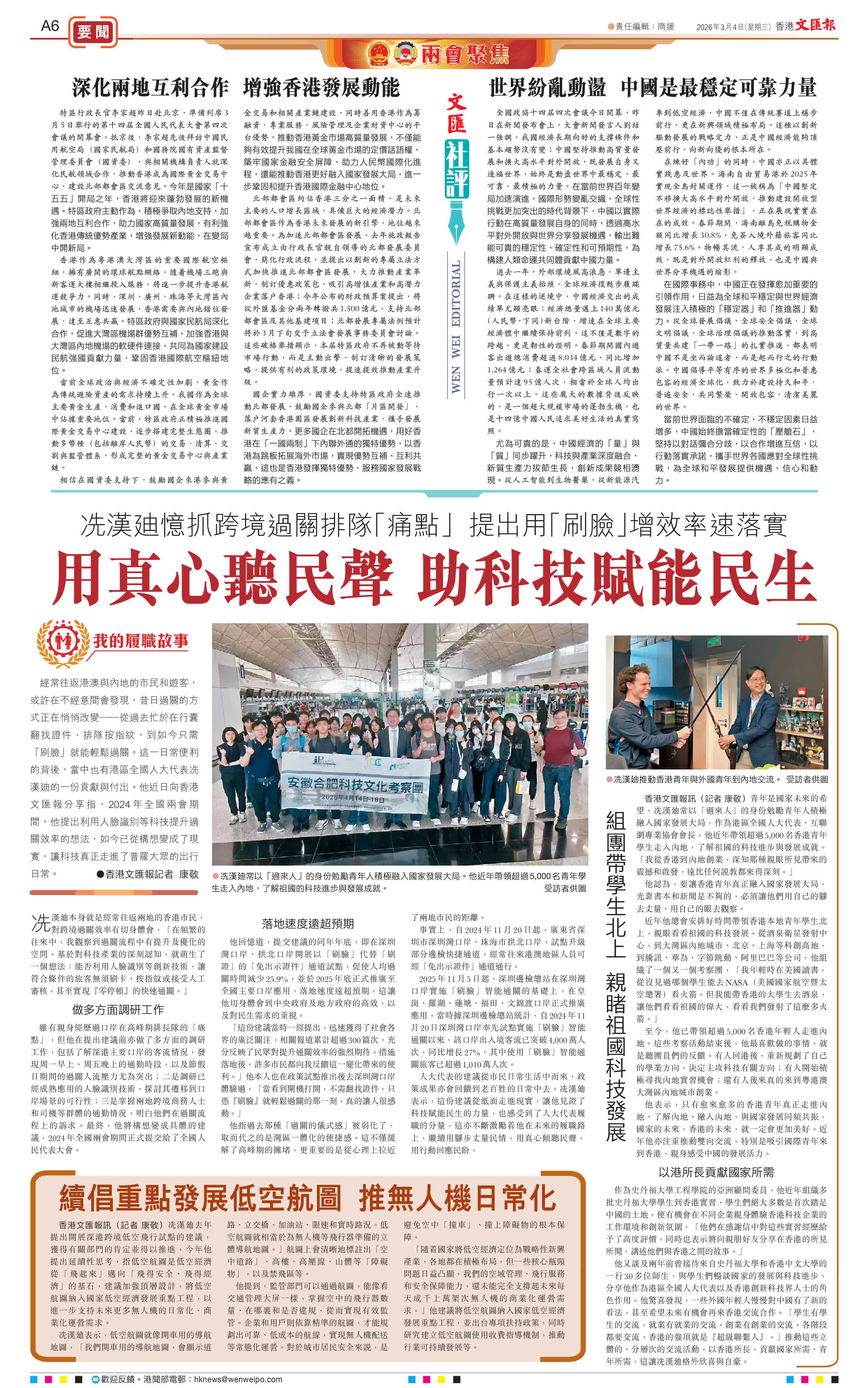 他又談及兩年前曾接待來自史丹福大學和香港中文大學的一行30多位師生,與學生們暢談國家的發展與科技進步,分享他作為港區全國人大代表以及香港創新科技界人士的角色作用。他驚喜發現,一些外國年輕人慢慢對中國有了新的看法,甚至希望未來有機會再來香港交流合作。「學生有學生的交流,就業有就業的交流,創業有創業的交流。各階段都要交流,香港的強項就是『超級聯繫人』。」推動這些立體的、分層次的交流活動,以香港所長,貢獻國家所需、青年所需,這讓冼漢廸格外欣喜與自豪。